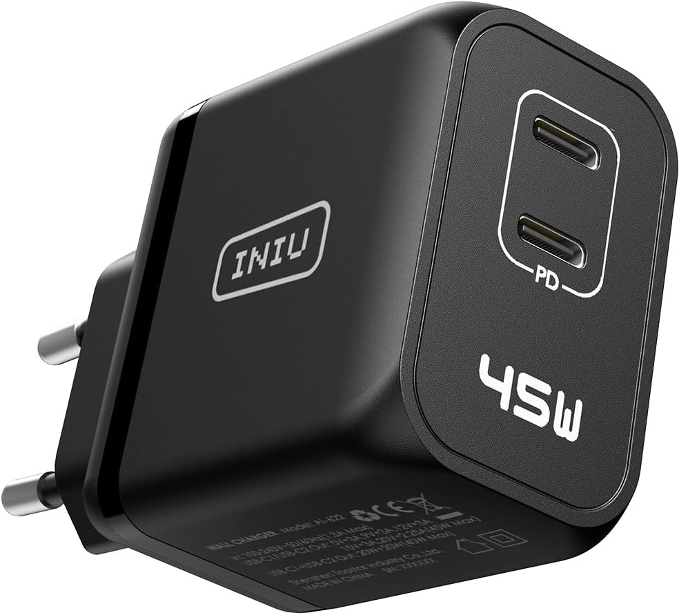 Caricatore con doppia porta USB-C PD (Power Delivery) per ricaricare simultaneamente lo smartphone e il tablet (o altro dispositivo – auricolari Bluetooth, smartwatch, powerbank, ecc.) con una potenza massima di 20 watt per porta (45 watt totali).