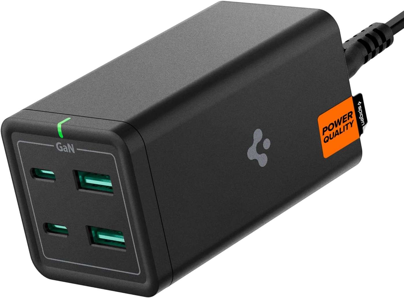 ArcDock di Spigen è un charging box ad alte prestazioni (120 watt) con due porte USB-C PD capaci di erogare fino a 100-120 watt su singola/doppia porta (adatti anche per due MacBook Pro da 14”) e altrettante USB-A per un massimo di 36 watt (18+18).