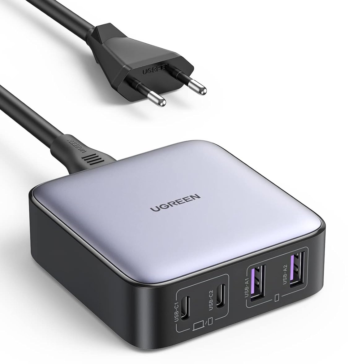 Le due porte USB-C sono adatte ai dispositivi ad alta potenza che richiedono fino a 65 watt (notebook, tablet, smartphone con ricarica ultra-fast, ecc.) mentre le due USB-A offrono fino a 22,5 watt per la ricarica normale e rapida di smartphone, smartwatch, auricolari BT, ecc.
