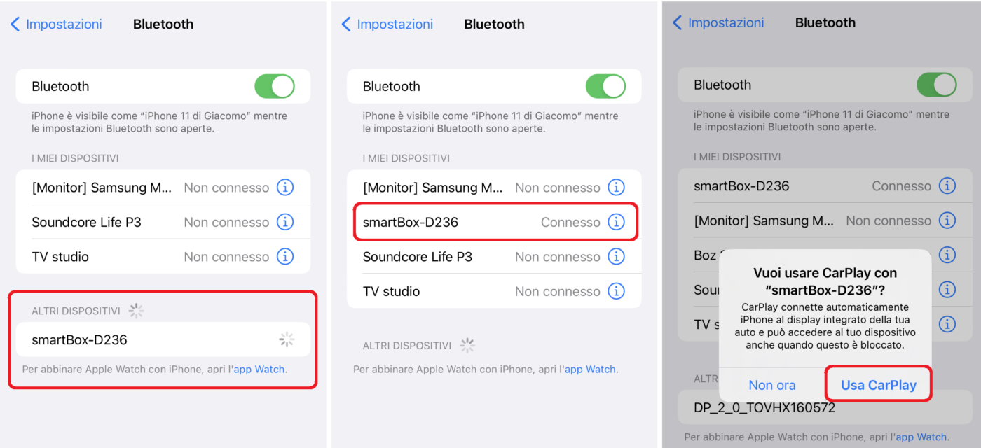 Se utilizzate un adattatore esterno dovete invece effettuare l’accoppiamento Bluetooth tra l’adattatore e l’iPhone (solo la prima volta) come indicato nel manuale d’installazione dell’adattatore (vedi qui un esempio).