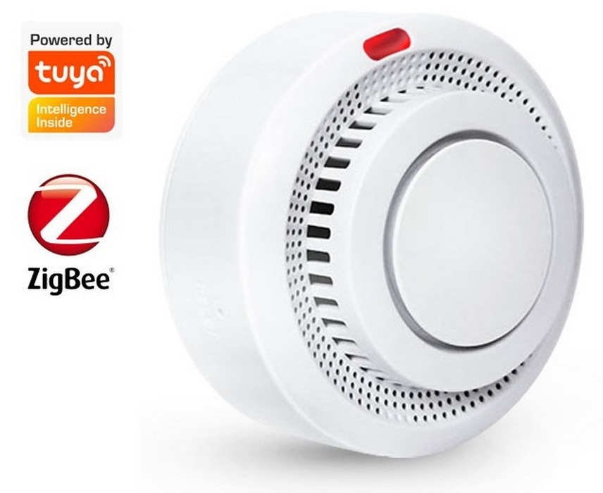 Sensore intelligente di fumo e allarme antincendio con collegamento tramite hub Zigbee 3.0 (Tuya o altri brand), sensore fotoelettrico ad alta sensibilità, circuito con algoritmo smart per evitare falsi allarmi e sirena integrata da 80 dB.