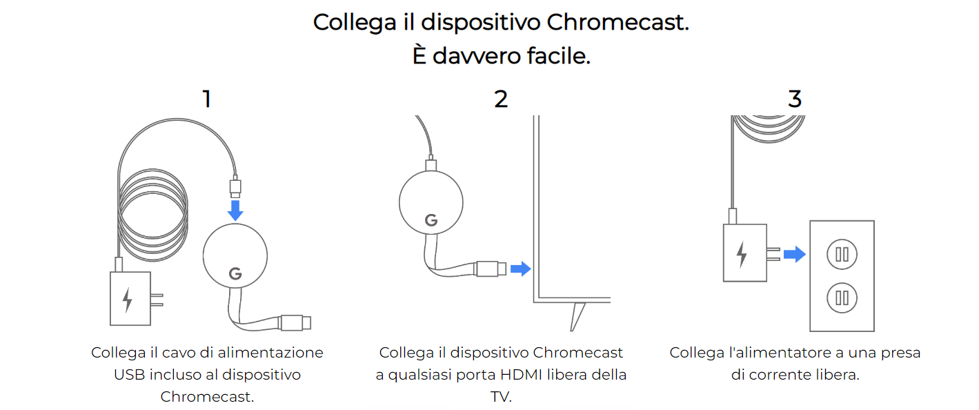 Dopo aver collegato il dongle ad una porta HDMI del Tv e all’alimentatore USB con il cavo USB-C, basta selezionare l’ingresso HDMI e procedere con la configurazione tramite la app Google Home installata sullo smartphone seguendo questo video tutorial oppure la guida online.