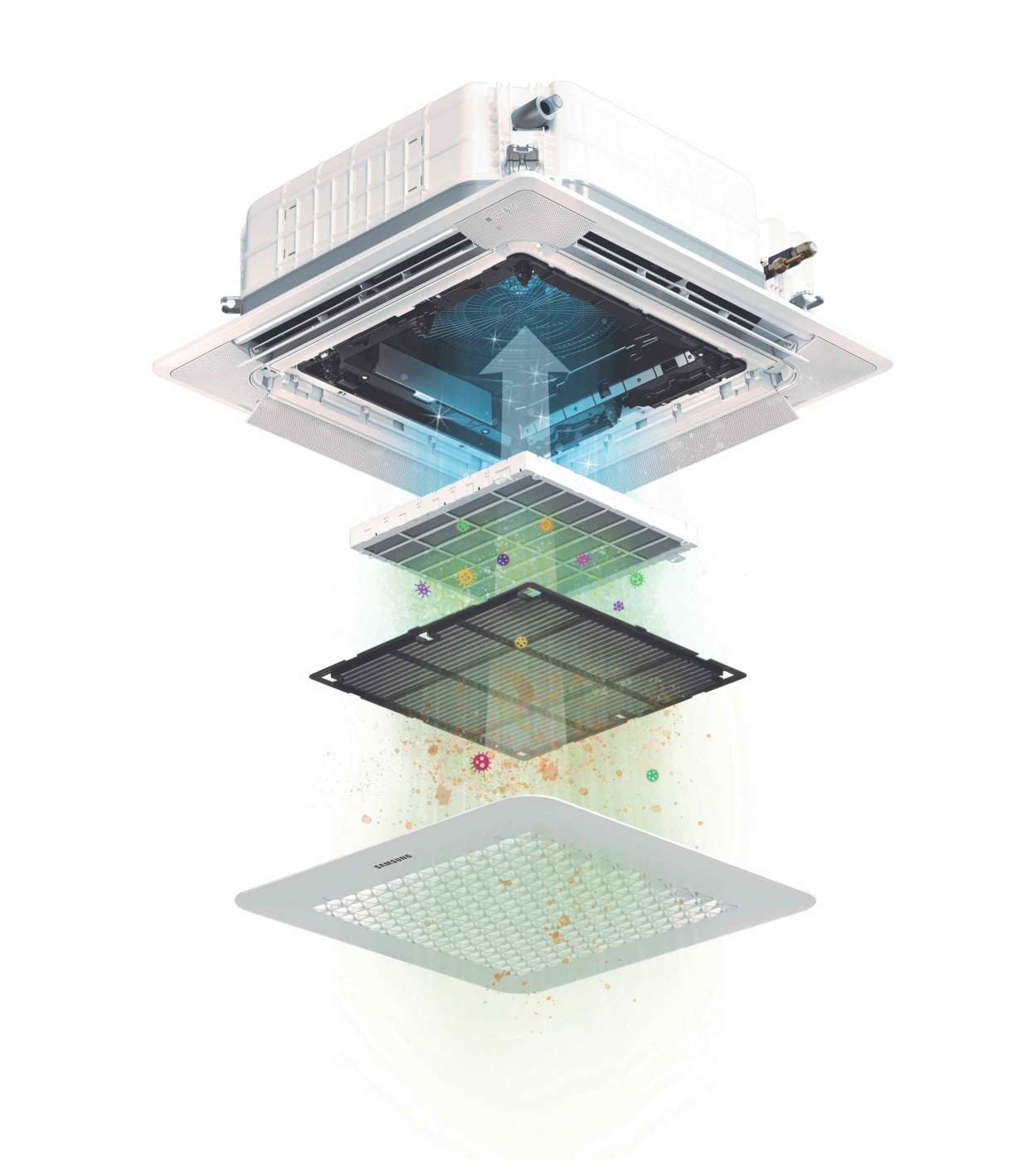 Il filtro PM1.0 cattura le polveri ultrafini di dimensioni fino a 0,3μm e sterilizza fino al 99% dei batteri intrappolati nel filtro e il prefiltro blocca le particelle di più grandi dimensioni prima che entrino nell’unità. Grazie al ricircolo dell’aria all’interno di una stanza e alla cattura delle particelle tramite carica elettrostatica, il filtro PM 1.0 presente nel WindFree Pure 1.0 e nei pannelli di purificazione non solo pulisce l’aria migliorando l’IAQ, ma impedisce anche che determinati agenti contaminanti si accumulino in modo dannoso nelle apparecchiature.
