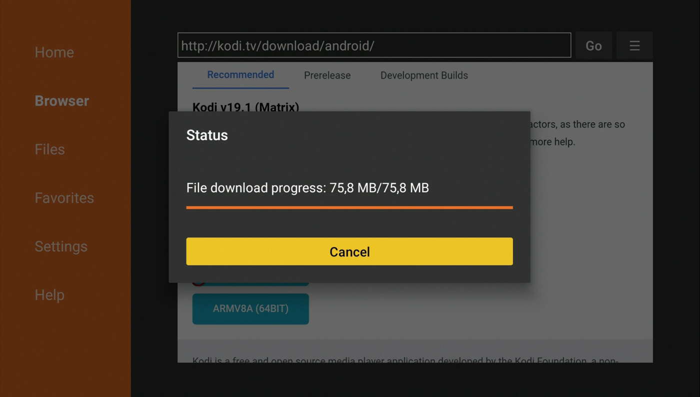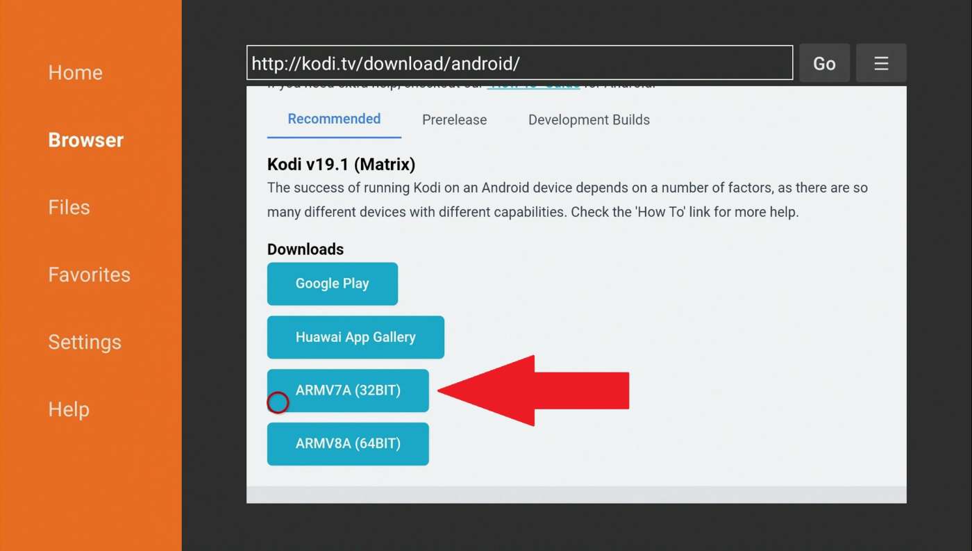 - Nel caso di Kodi, scendere in basso, posizionare il cursore sulla versione ARMV7A (32BIT) e premere OK;