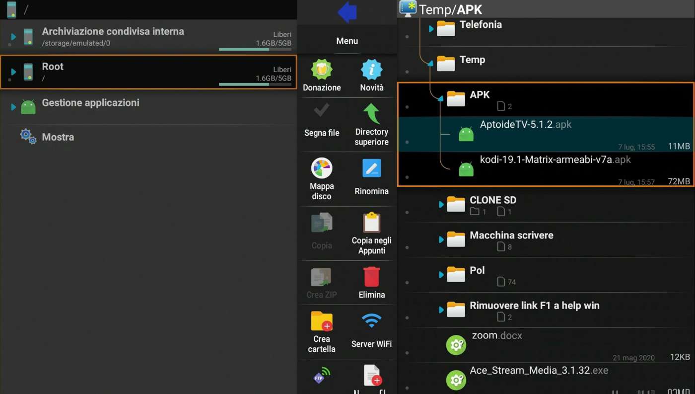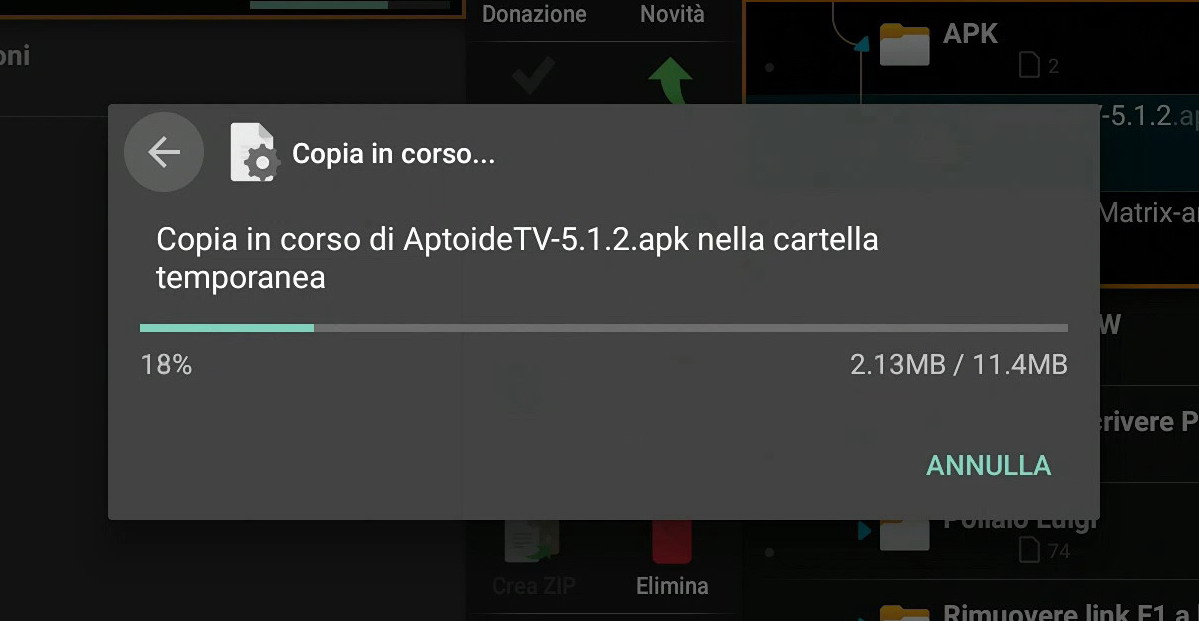 - Selezionare il file apk e premere OK per far partire la copia e l’installazione;