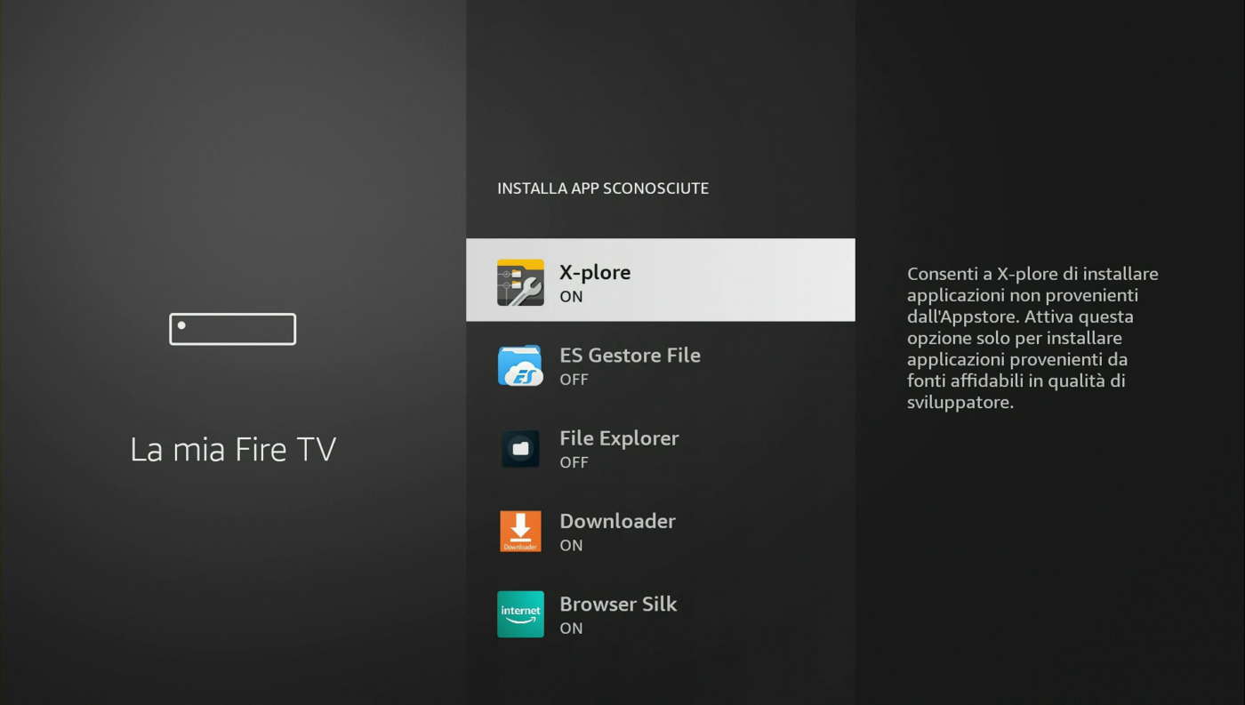 - Abilitare l’autorizzazione all’installazione delle app sconosciute come spiegato sopra (Impostazioni Fire TV Stick > La mia Fire TV > Opzioni Sviluppatore > Installa app sconosciute > ES File Esplorer/X-plore ON);