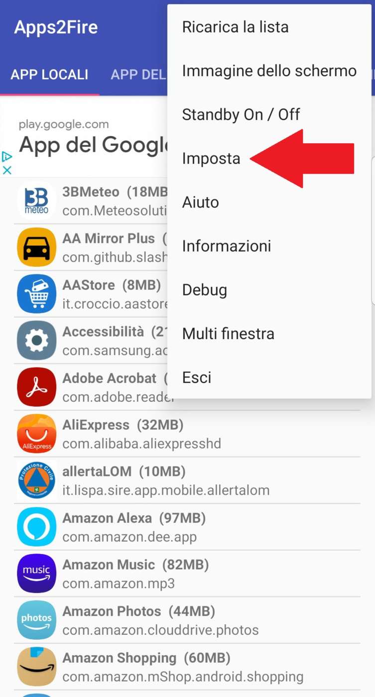 - Lanciare la app, cliccare sui tre punti in alto a destra e selezionare la voce Imposta;