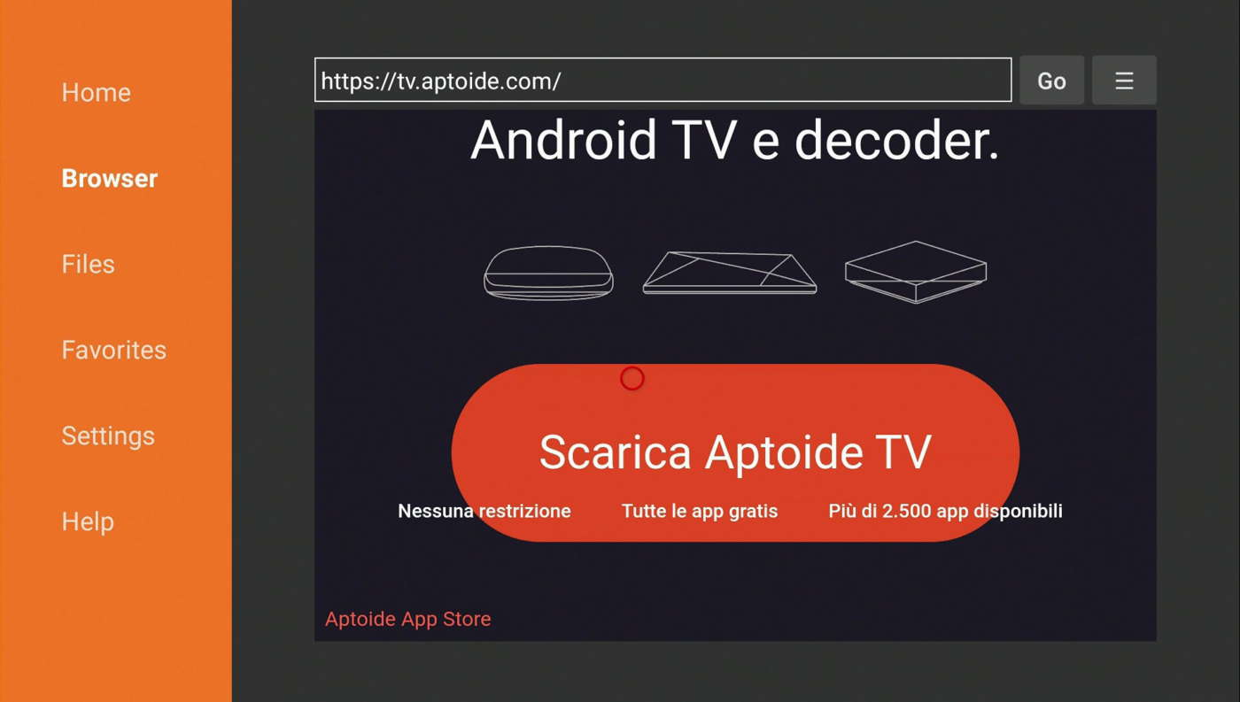 - Digitare nello spazio URL in alto l’indirizzo del sito web da cui si vuole scaricare il file apk (es.: kodi.tv/download, www.apkmirror.com o tv.aptoide.com) e cliccare su Go;