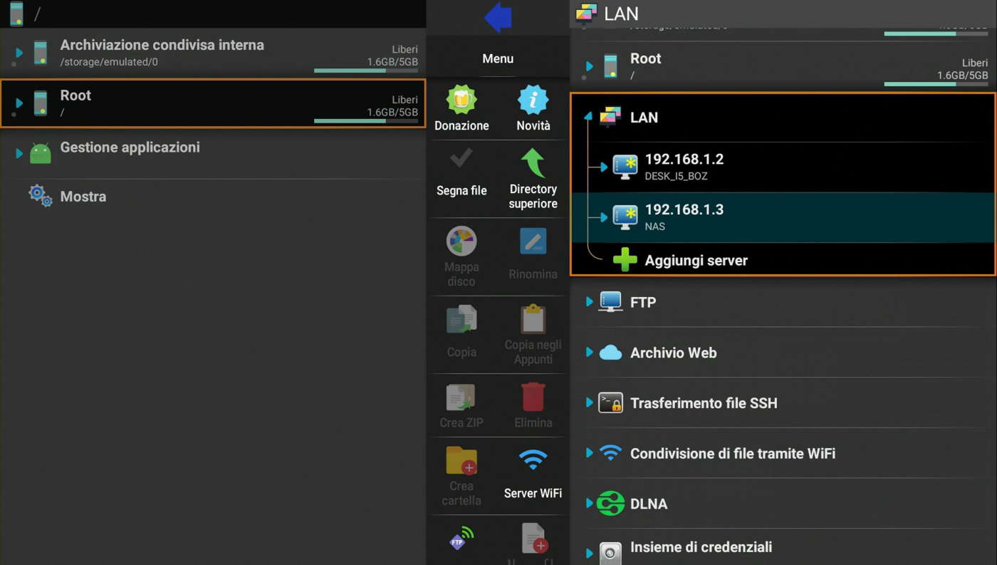- Cercare nella schermata principale le voci Rete e/o LAN, effettuare la scansione della rete locale alla ricerca dei dispositivi di condivisione (es.: NAS o PC) e poi scegliere quello che contiene l’apk (NAS/Temp/APK nel nostro caso);
