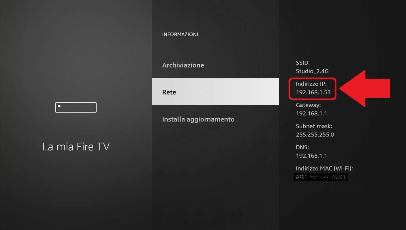 - Digitare l’indirizzo IP della Fire TV Stick come riportato nel menu Impostazioni (La mia Fire TV > Informazioni > Rete – es.: 192.168.1.53) e poi cliccare su In alternativa è possibile ricercare la Fire TV Stick collegata alla rete LAN cliccando su Cerca nella Fire TV;
