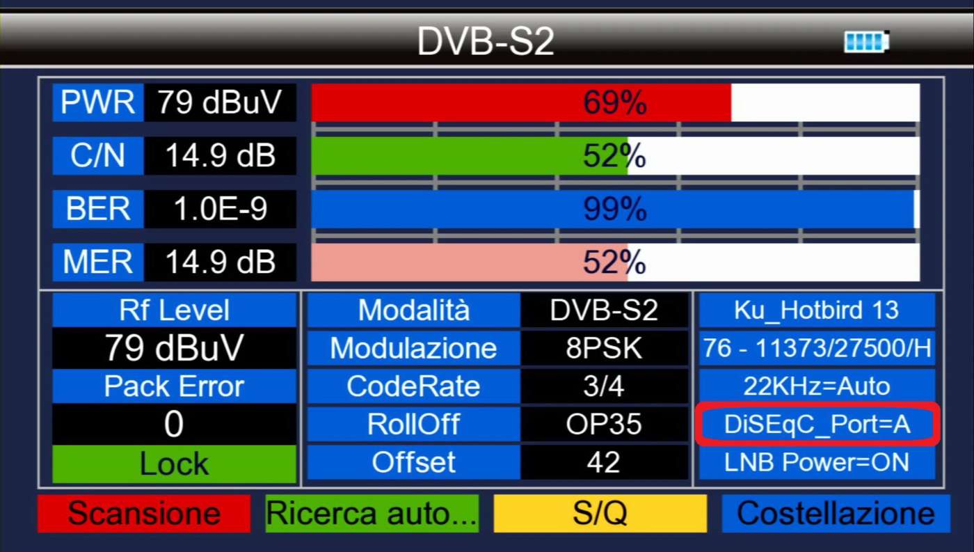 Poi si passa al secondo LNB, agli ultimi ritocchi sull’elevazione ed infine al fissaggio di viti, dadi e bulloni. La procedura si conclude con il collegamento dei due LNB agli ingressi dello switch DiSEqC (ingresso LNB 1 – Hot Bird, ingresso LNB 2 – Astra), con gli ulteriori controlli di livello e qualità del segnale (a turno impostando il DiSEqC prima sulla porta A o 1 e poi sulla B o 2) e con il collegamento dell’uscita dello switch DiSEqC (Receiver) al cavo coassiale di discesa che porta il segnale alla presa SAT in casa.