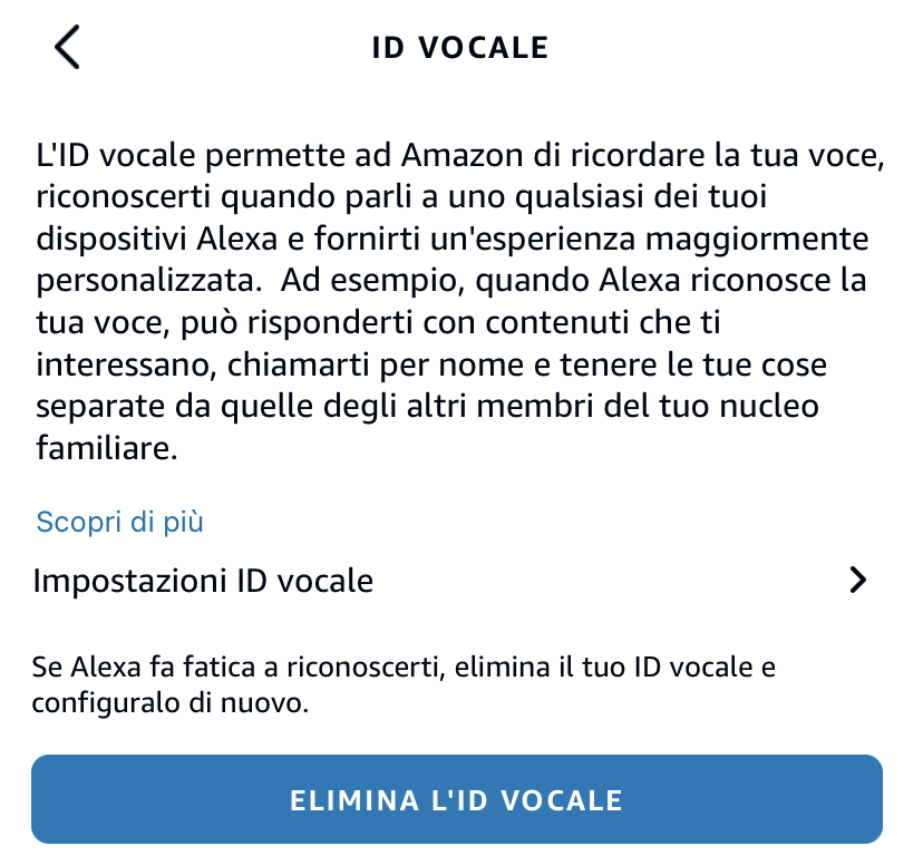 Se commettete errori oppure volete ripetere la procedura in un secondo momento, vi basterà cliccare su “ID Vocale”, poi su “Elimina l’ID Vocale” e ricominciare da capo (via app o web).