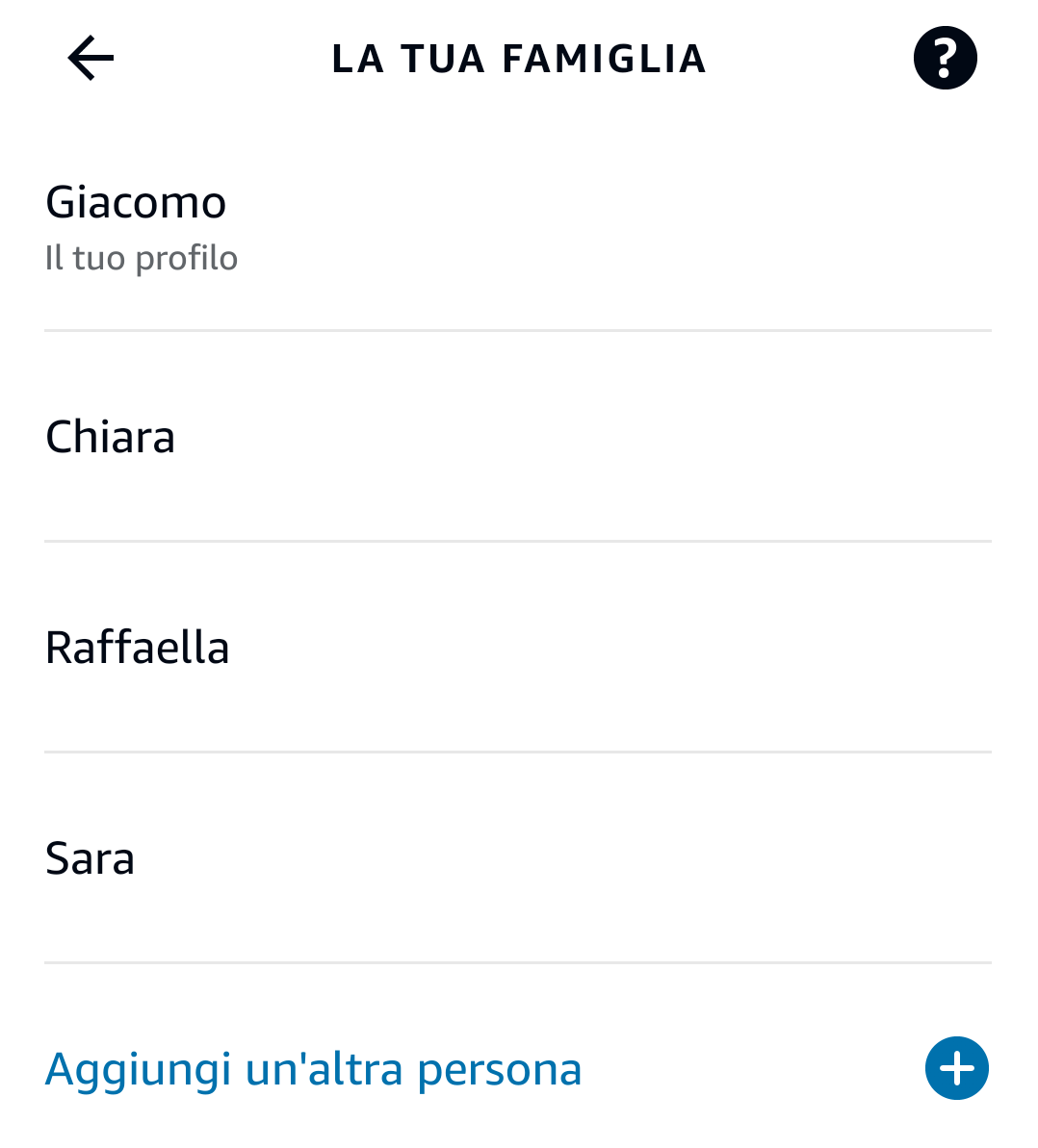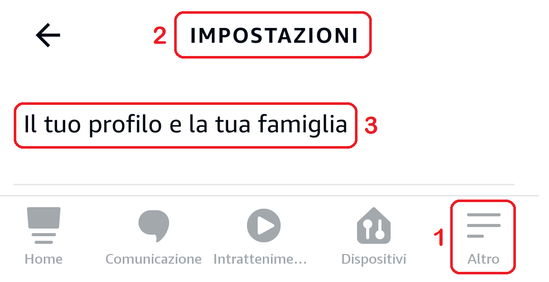 Per semplificare la procedura che vi descriveremo più avanti, consigliamo innanzitutto al proprietario del dispositivo di accedere all’app Alexa, cliccare sull’icona “Altro” in basso a destra, poi su “Impostazioni” e infine “Il tuo profilo e la tua famiglia”.
