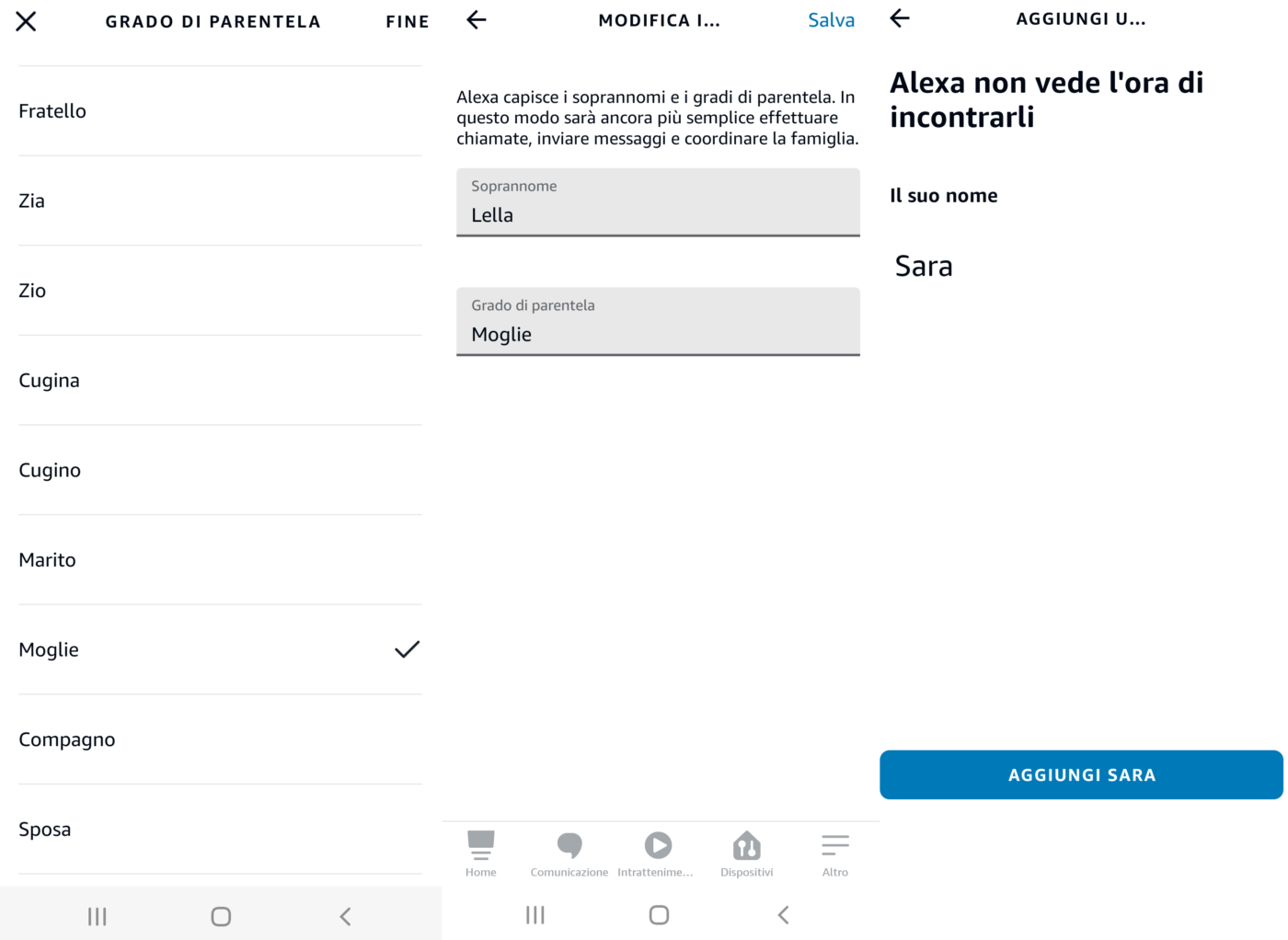 Cliccando su ciascun nome è possibile inserire nome, cognome, soprannome e grado di parentela (figlio, zio, moglie, compagno, ecc.) per far comprendere ad Alexa come è composta la vostra famiglia e facilitare l’uso di chiamate, messaggi ed altre funzioni.