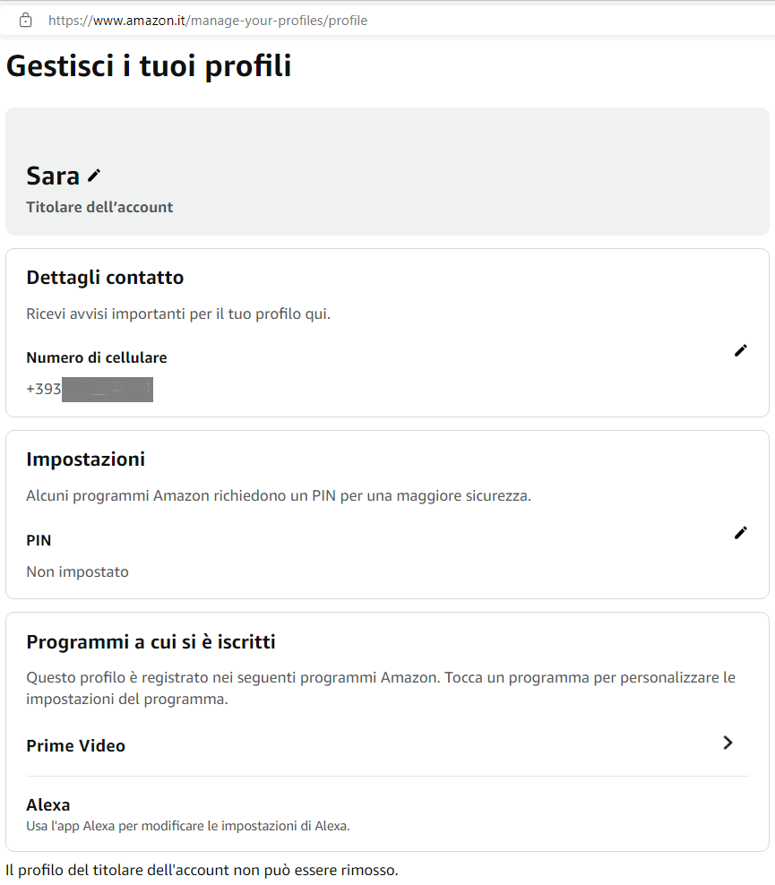 Per ulteriori personalizzazioni (es.: numero cellulare, PIN per proteggere dati e impostazioni personali, ecc.) bisogna usare la app Alexa dopo essersi loggati con i rispettivi account Amazon. I soli dati di contatto e PIN si possono inserire e modificare anche dalla pagina web https://www.amazon.it/manage-your-profiles.