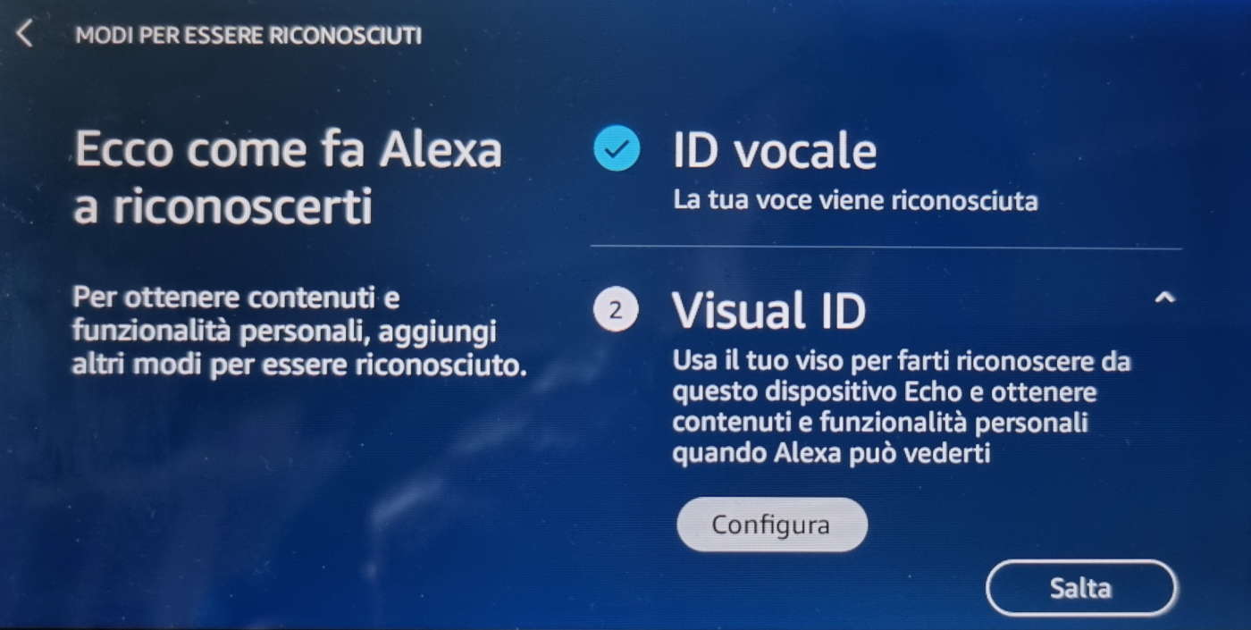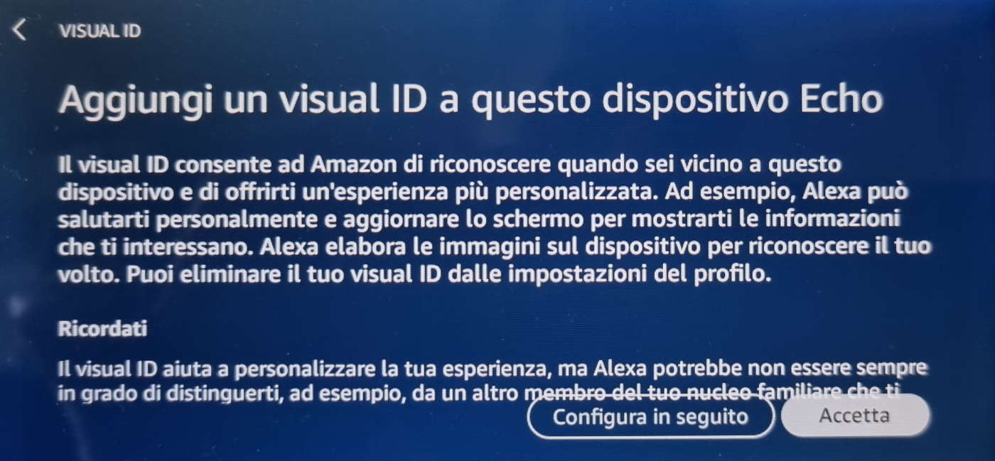 Se possedete due o più Echo Show, la procedura di registrazione del Visual ID va ripetuta per ogni dispositivo dal quale volete farvi riconoscere.