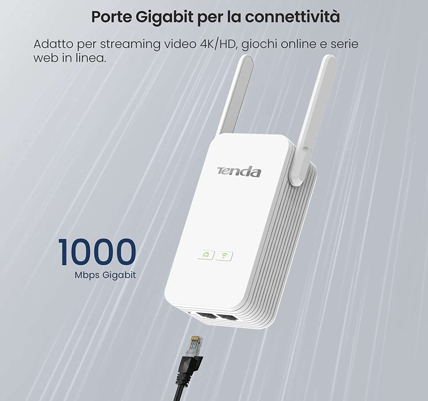 - Velocità max: 200+433 Mbps (Wi-Fi), 1000 Mbps (PLC)