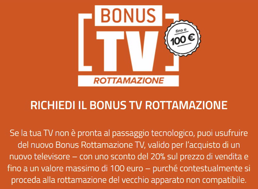 Il Bonus Tv Rottamazione, disponibile per tutti i cittadini italiani abbonati al canone Rai che acquistano un nuovo televisore rottamando quello vecchio, consente di ottenere uno sconto del 20% sul prezzo di vendita fino ad un massimo di 100 euro.
