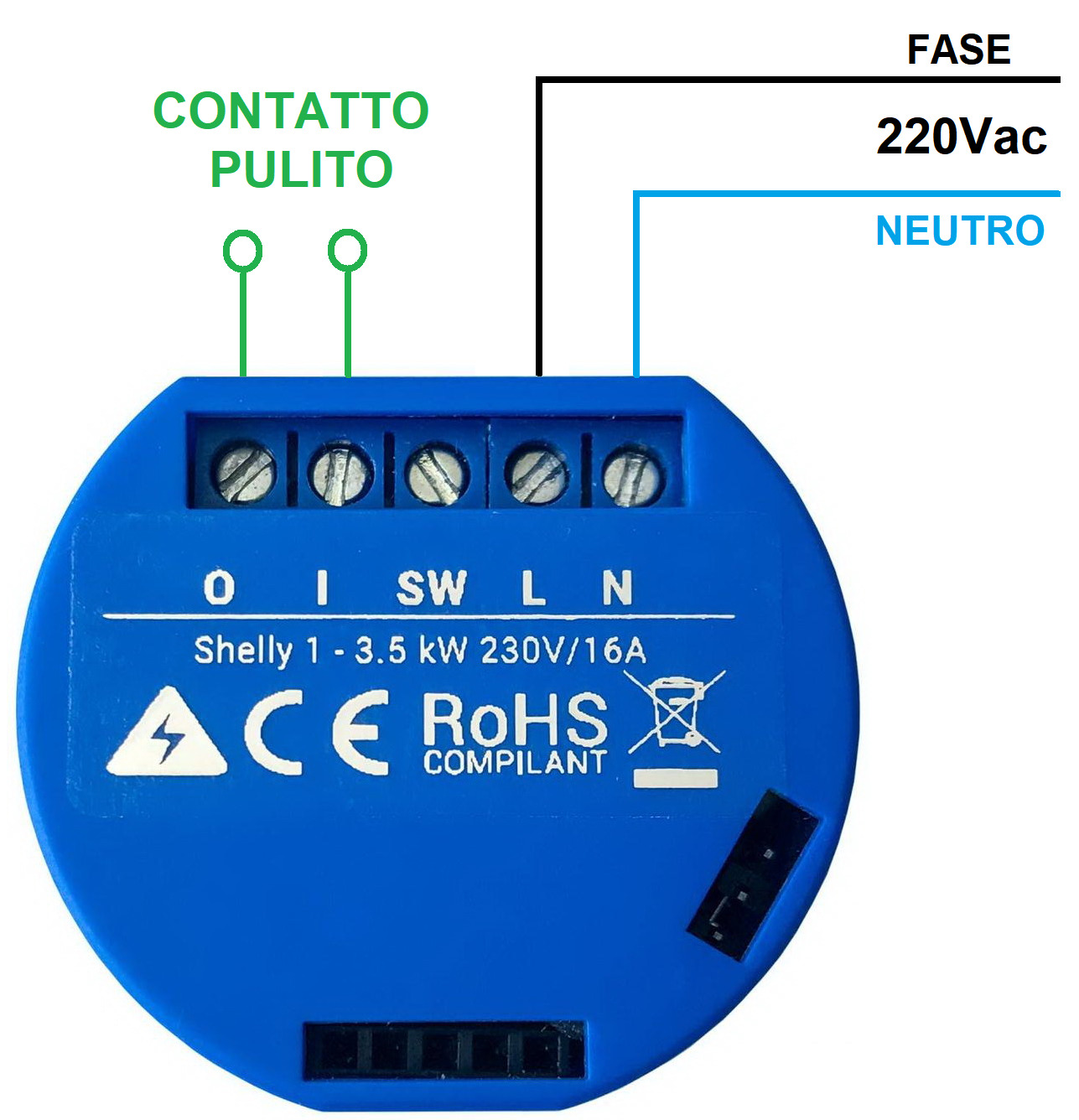 Smart switch ultra-compatto (anche da incasso in scatola 503) con uscita a contatto pulito e alimentazione diretta da rete 220Vac espressamente progettato per l’apertura e la chiusura di serrande motorizzate (anche cancelli) tramite smartphone e comandi vocali.