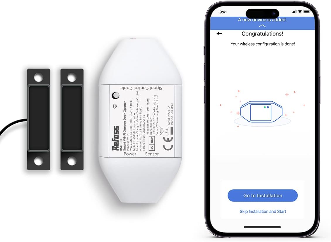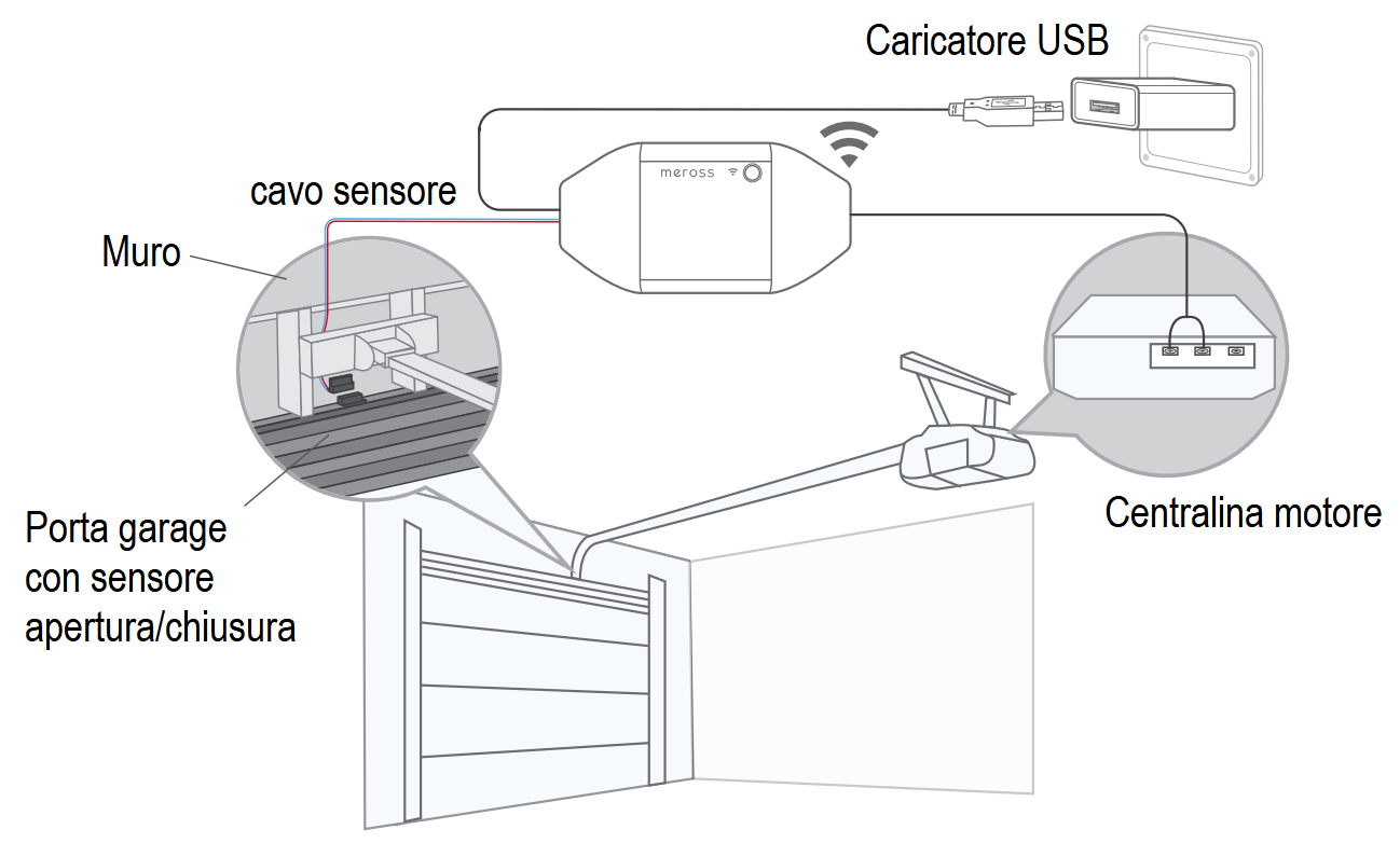 Il kit comprende tutto il necessario per il fissaggio e l’installazione (cablaggi, staffe, viti, fascette, ecc.) incluso il sensore magnetico che funge da finecorsa e permette anche di ricevere notifiche push istantanee sullo smartphone al momento dell’apertura, della chiusura e per verificare da remoto lo stato (aperto o chiuso).