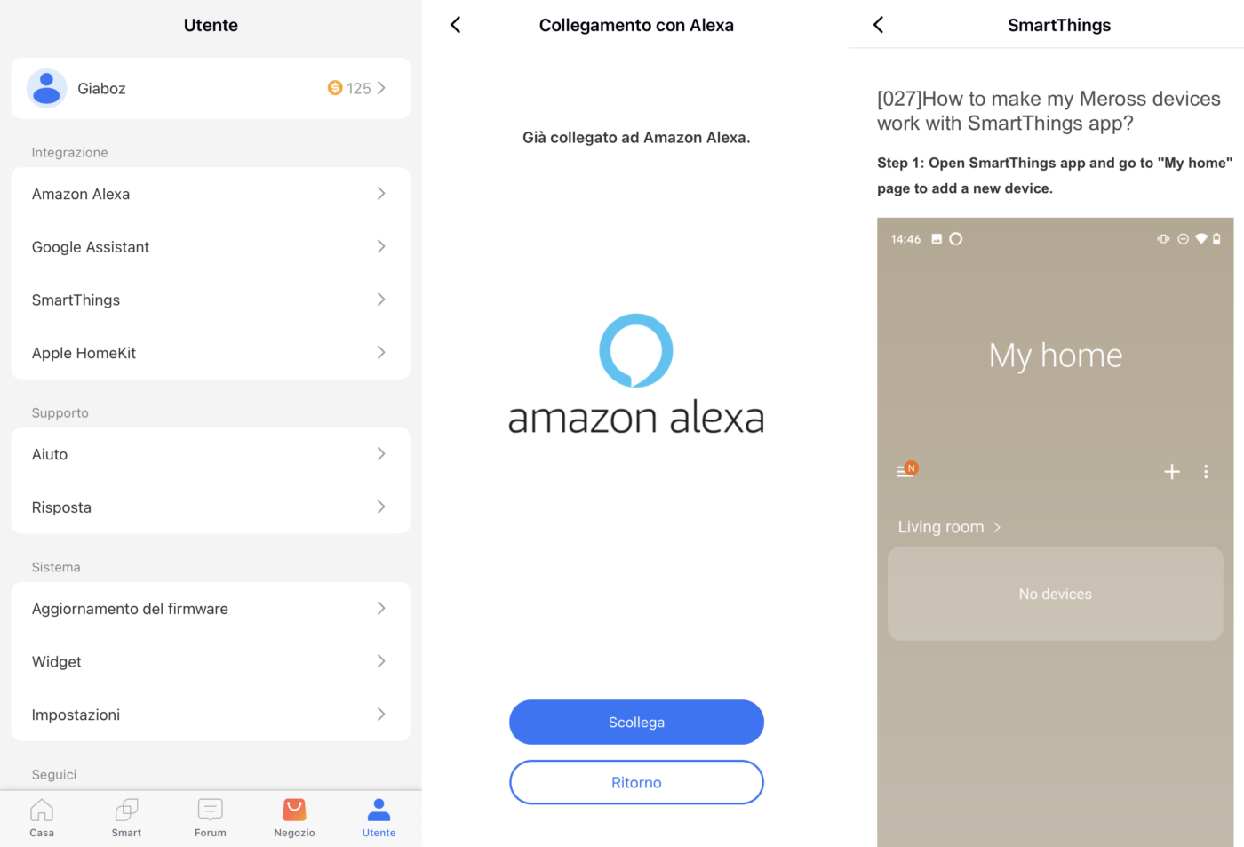 Per abilitare il controllo da queste piattaforme basta aprire la app, cliccare sulla scheda Utente o Impostazioni, selezionare Amazon Alexa, Google Assistant, SmartThings e/o Apple HomeKit, abbinare gli account (es.: Meross e Amazon) e seguire le istruzioni sullo schermo.