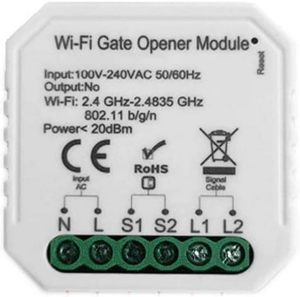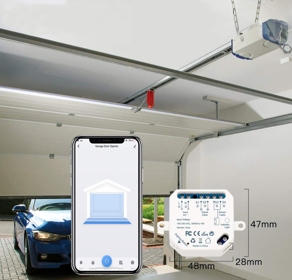 Occupa poco spazio e può essere installato sia vicino al motore sia in una scatola da incasso tipo 503. Si alimenta a 220Vac e si controlla con la app Tuya Smart/Smart Life, con i comandi vocali di Alexa/Google (con codice PIN di sicurezza) e con le piattaforme domotiche e di automazione multi-brand come SmartThings e IFTTT.