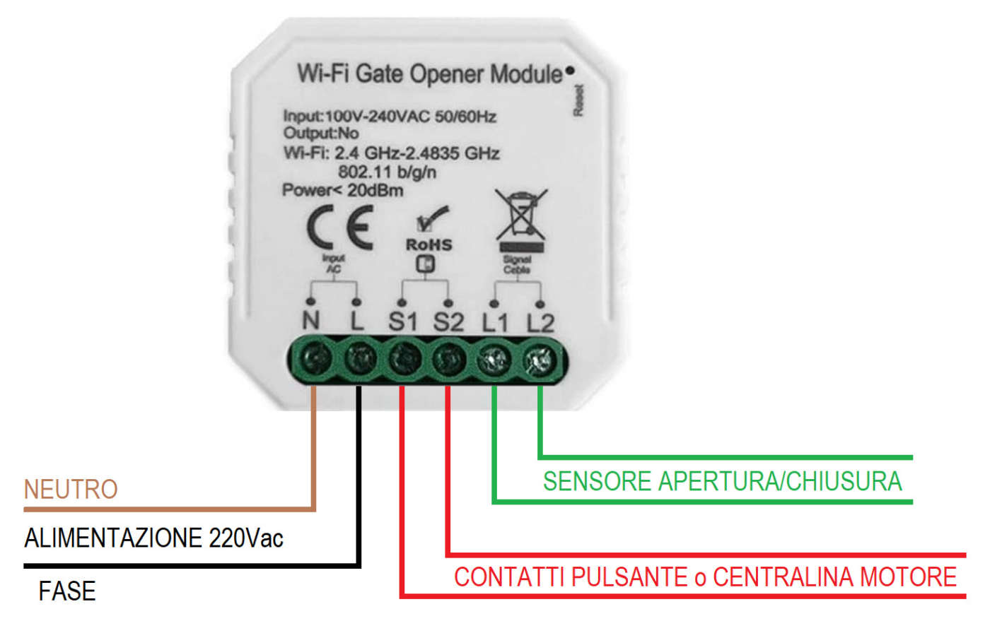È dotato di morsetto per i collegamenti rapidi al pulsante apriserranda (o centralina motore), alla rete 220Vac e al sensore magnetico di posizione (incluso nel kit insieme a cablaggi, viti, ecc.).