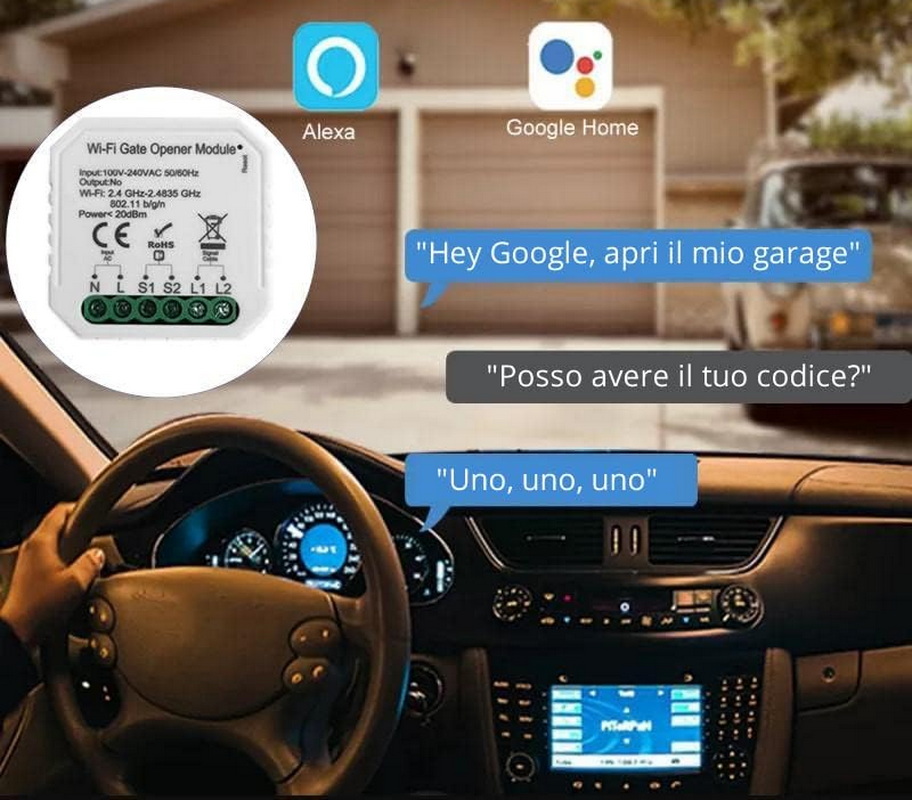 L’abbinamento dello smart switch ad Alexa, Google e HomeKit vi consente di aprire e chiudere la basculante con un semplice comando vocale come “Alexa, apri il garage” oppure “Hey Siri, chiudi il garage”, anche con la sicurezza del codice PIN per evitare aperture indesiderate.