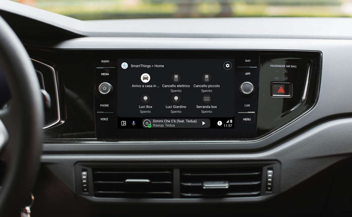 Se la app che comanda lo smart switch supporta l’integrazione con SmartThings oppure utilizzate uno dei modelli Shelly come l’1 V3 (vedi schema sopra) potete anche aprire la serranda direttamente dal display touch dell’autoradio (infotainment) se compatibile con Android Auto (nel caso di SmartThings) e/o CarPlay (con la app Shelly Cloud).