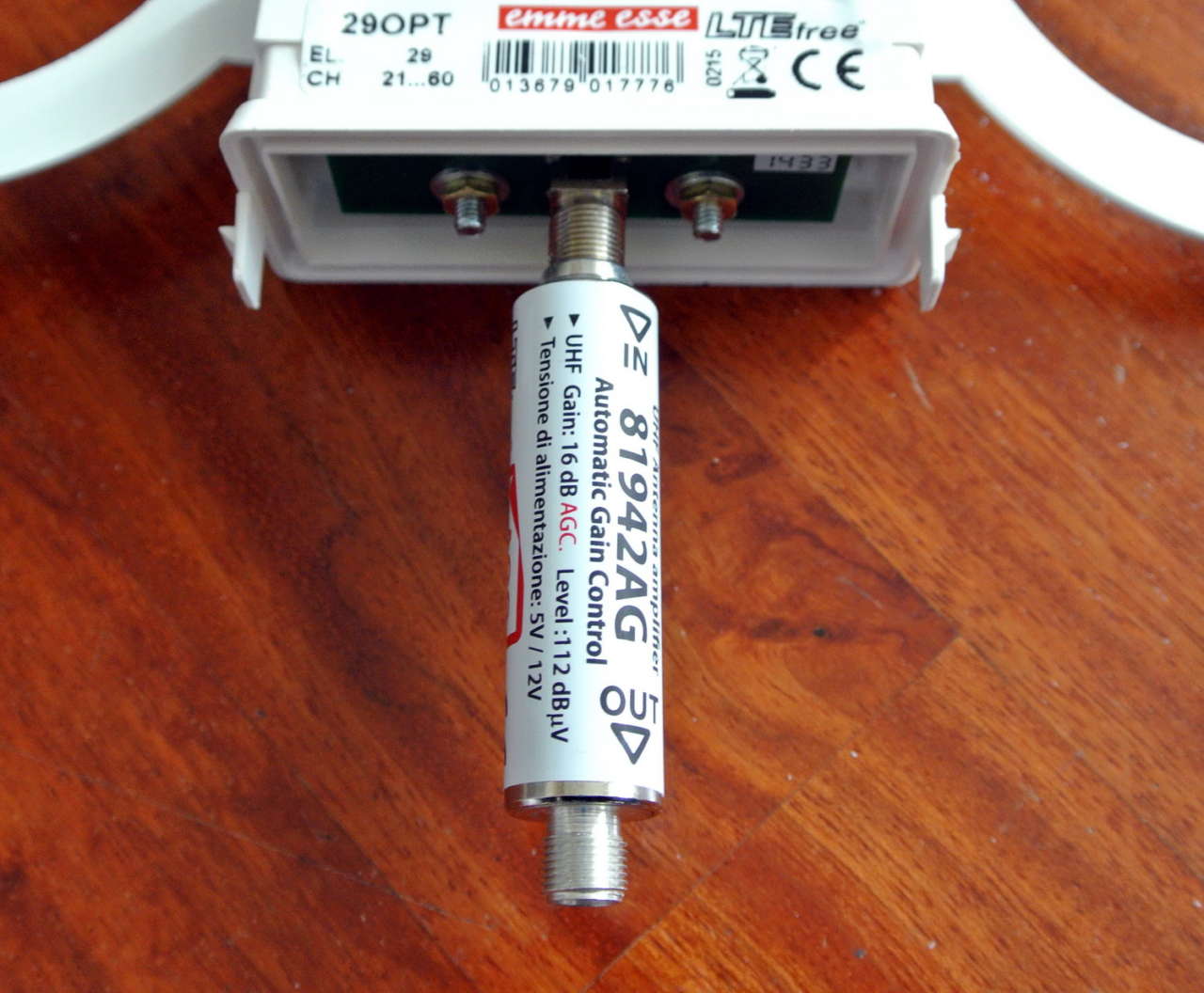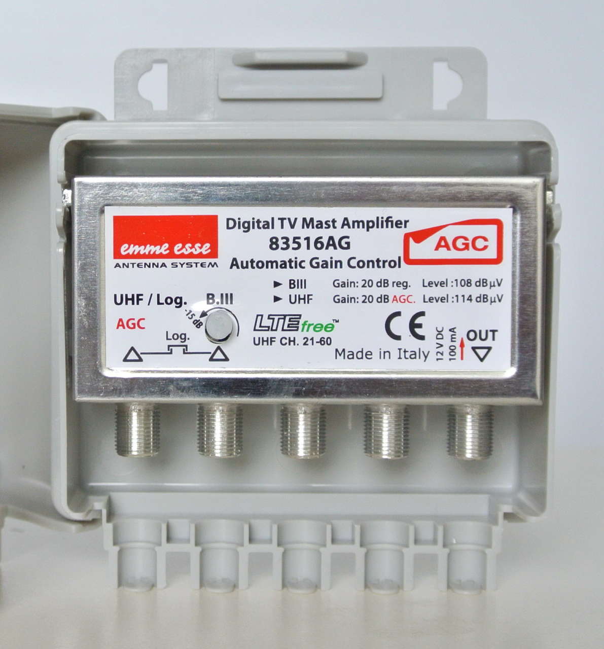 L’amplificatore ADAG (81942AG) è del tipo a innesto, ovvero progettato per essere applicato direttamente al dipolo di un’antenna UHF (come la Optica della stessa Emme Esse) oppure lungo il cavo di discesa. Grazie all’eccellente compromesso tra massimo livello di uscita e fattore di rumore, può essere utilizzato anche come preamplificatore in presenza di segnali non critici per incrementarne il livello quanto basta a servire impianti di poche prese. Il guadagno AGC è di 16 dB, il livello di uscita massimo è di 112 dBµV mentre la figura di rumore è pari a 2 dB. Anche questo modello integra il filtro LTE SAW.