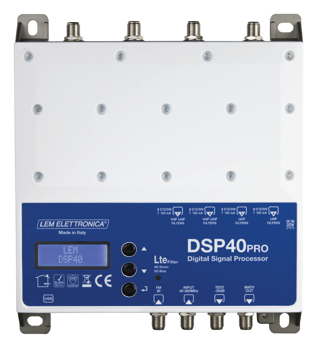 La centrale programmabile DSP40PRO della bresciana LEM Elettronica è dotata di 6 ingressi (FM, 2xBIII-DAB/UHF, 2xUHF, VHF-UHF) e 32 filtri VHF-UHF ad alta selettività con tecnologia dCSS per il filtraggio e la conversione digitale dei mux terrestri. L’amplificatore a basso rumore integrato con finale push-pull, l’AGC con dinamica di 40 dB indipendente per ogni filtro e l’uscita di alto livello (fino a 124 dBµV) ne consentono l’installazione in impianti di medie e grandi dimensioni. Da segnalare anche i filtri LTE 4G/5G selezionabili con tecnologia SAW, la programmazione diretta da display LCD o tramite Pc, smartphone e tablet Android, la scansione e la memorizzazione automatica dei mux VHF/UHF con equalizzazione al livello desiderato, l’alimentatore switching esterno.