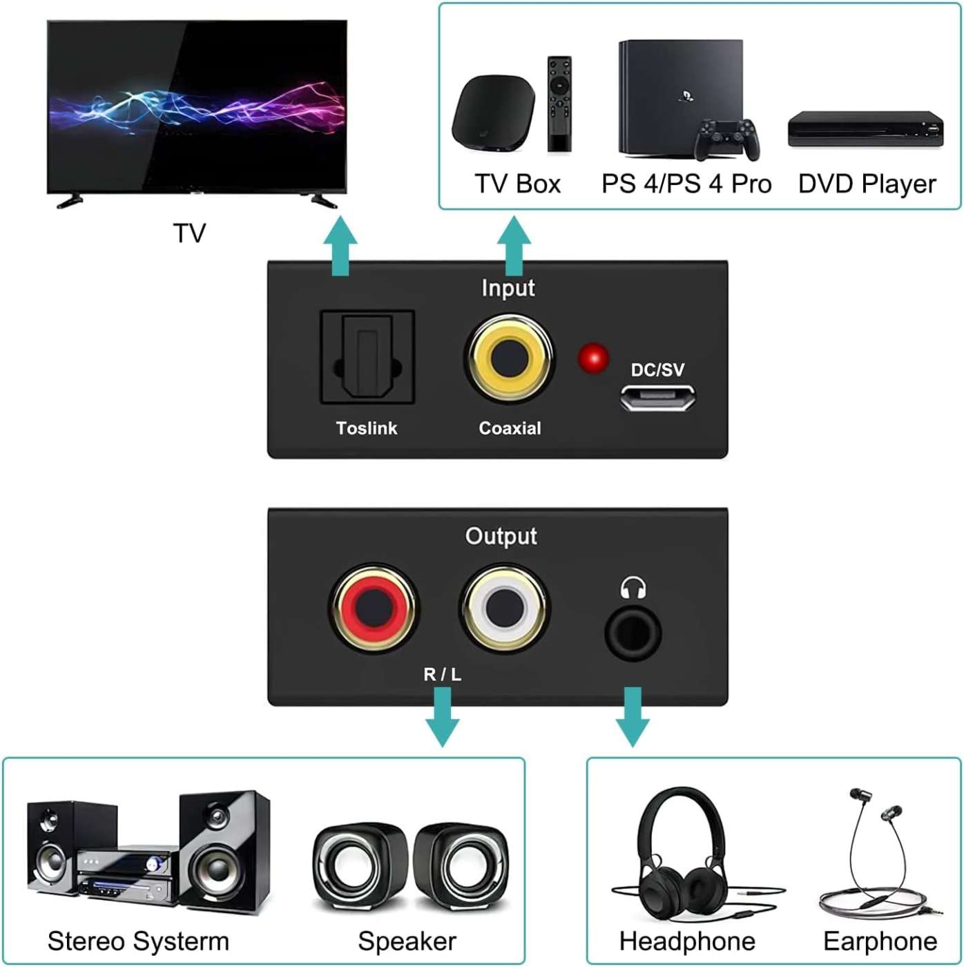 Il convertitore non richiede installazione né configurazione: basta collegarlo all’uscita audio digitale della sorgente (presa Toslink ottica o RCA/Cinch elettrica), all’apparecchio che dovrà ricevere l’audio analogico (cuffia, Hi-Fi, ecc.) e alimentarlo.