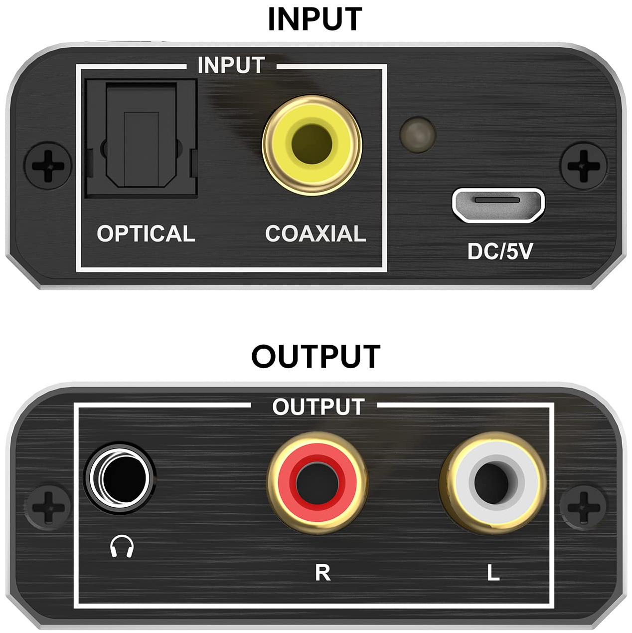 Quasi tutti i convertitori mettono a disposizione entrambi i formati RCA/Cinch e mini-jack (3,5 mm) così da soddisfare qualsiasi necessità e permettere di collegare sia l’impianto Hi-Fi (solitamente via RCA/Cinch) sia la cuffia a filo (mini-jack). Esistono anche convertitori dotati delle sole uscite RCA/Cinch oppure mini-jack per specifiche esigenze.