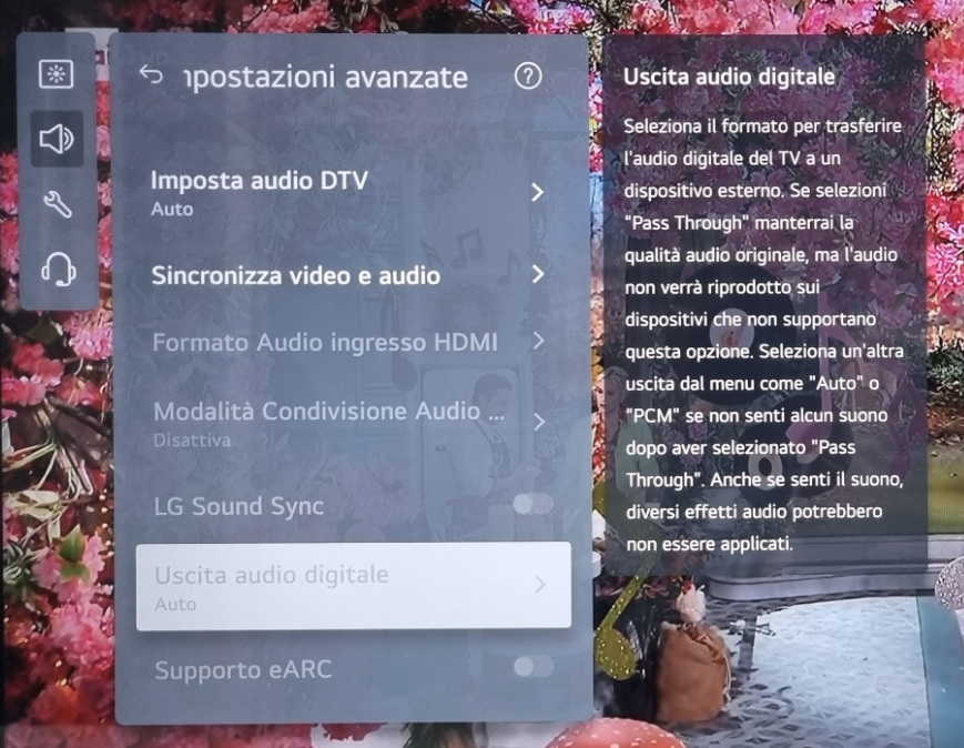 Fortunatamente, quasi tutte le sorgenti come Smart TV, box IPTV e decoder terrestri/satellite permettono di impostare da menù OSD la tipologia di uscita audio digitale così da convertire in PCM/LPCM anche le tracce audio surround trasmesse in Dolby Digital o Dolby Digital Plus (canali televisivi HD, IPTV, file audio/video, ecc.).
