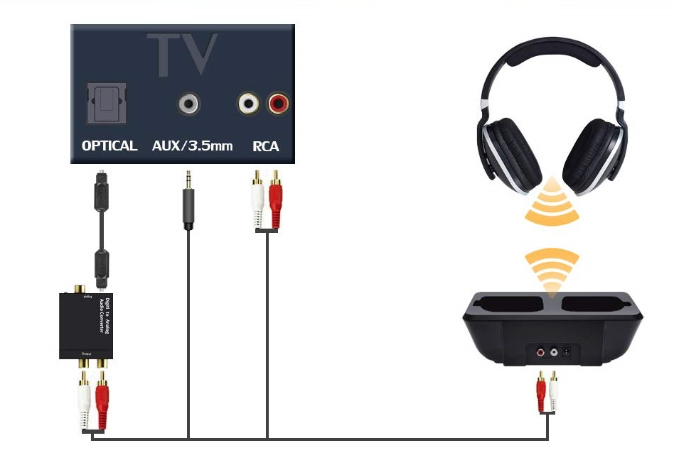 Connessioni audio del trasmettitore al TV: se si usa un trasmettitore gli ingressi del segnale audio dal TV possono essere una o più delle seguenti tipologie: jack 3,5 mm, RCA e ottico (Toslink). Va segnalato che diversi modelli di TV di ultima generazione non possiedono l’uscita jack 3,5 e in tal caso bisogna usare una delle altre uscite (RCA, Toslink o anche SCART). Se si usa l’uscita jack vengono esclusi gli altoparlanti del TV; se si vuole continuare a sentire anche il suono dagli altoparlanti invece del jack 3,5 occorre usare un’altra delle due connessioni disponibili. Se si vuole ascoltare la TV con più di una cuffia, nel caso dei prodotti Wireless non c’è problema essendo il sistema compatibile fino a 4 cuffie. Nel caso di Bluetooth occorre invece dotarsi di un trasmettitore multipoint che consente fino a 2 cuffie collegate contemporaneamente. La versione di Bluetooth 5.2, da metà 2020, prevede la funzionalità broadcast per condividere la trasmissione su quante cuffie si vorrà.