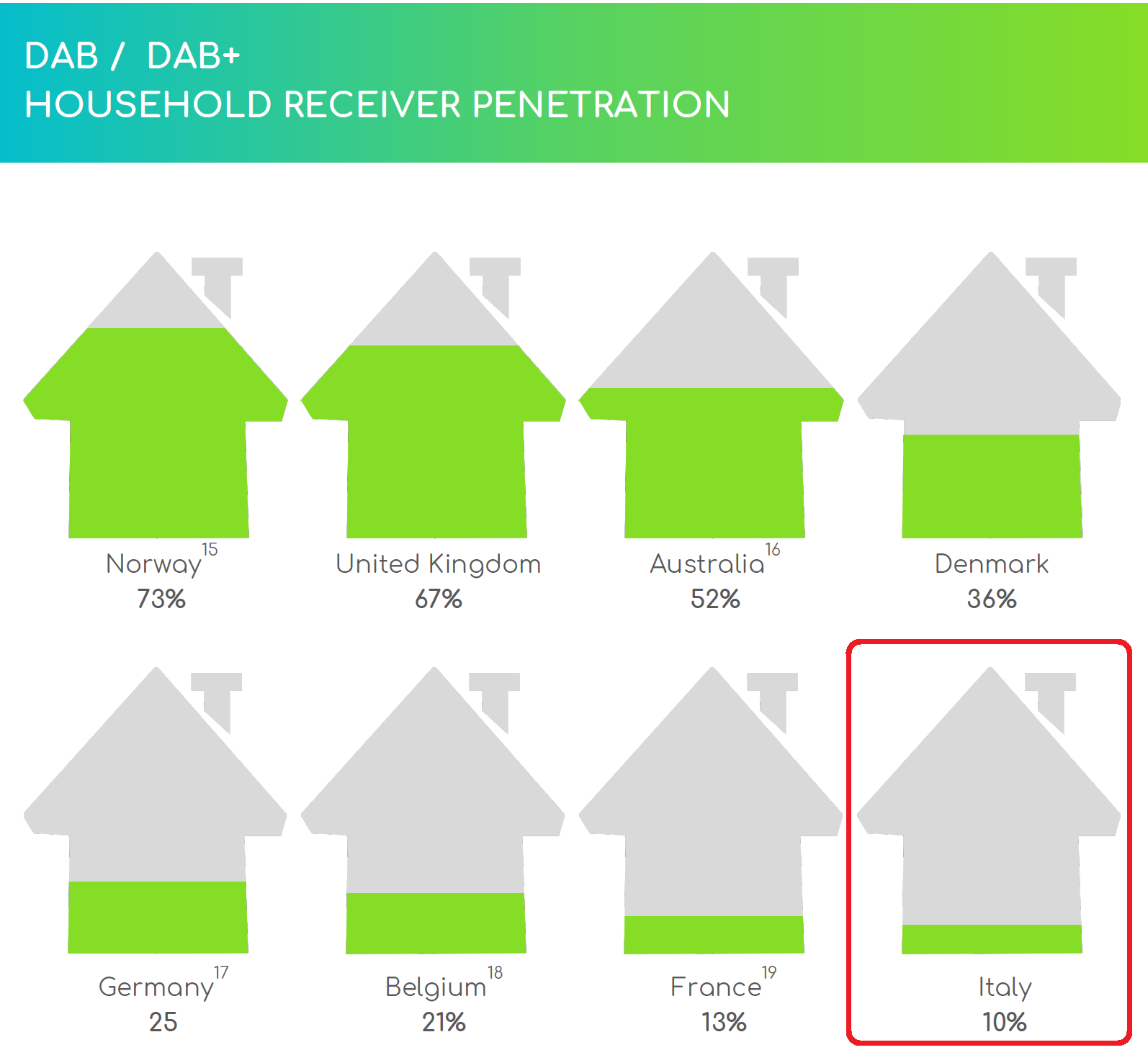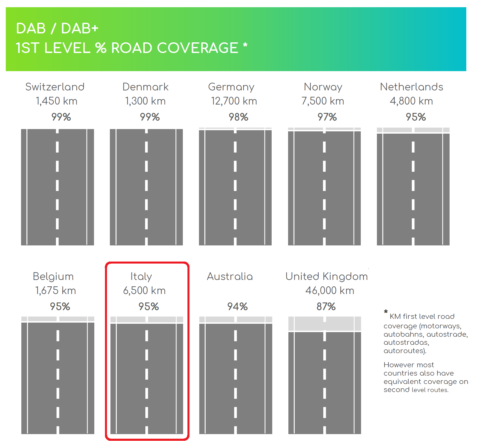 Nell’ultimo anno, complice la massiccia campagna informativa, la riduzione dei prezzi e l’obbligatorietà del sintonizzatore DAB+ su tutti i ricevitori radio venduti dal 1° gennaio 2020 (con alcune eccezioni nel settore automotive), gli italiani hanno imparato ad apprezzare e ascoltare la DigitalRadio. Secondo gli ultimi dati pubblicati da World DAB, un’organizzazione che si occupa della promozione della DigitalRadio in tutto il mondo, la copertura ha ormai raggiunto l’84% della popolazione italiana e il 65% delle strade a lunga percorrenza (6500 km circa).