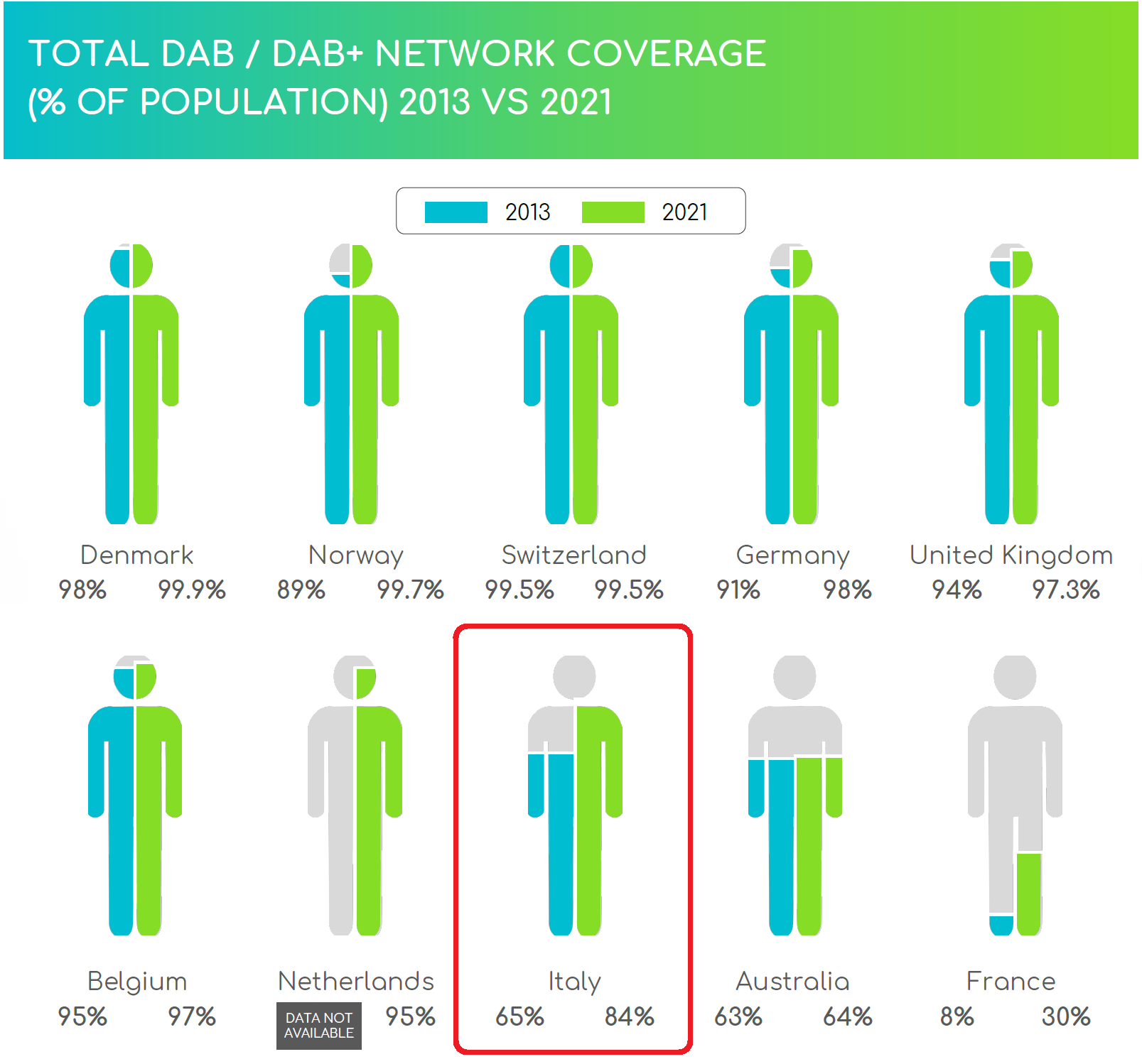 Nell’ultimo anno, complice la massiccia campagna informativa, la riduzione dei prezzi e l’obbligatorietà del sintonizzatore DAB+ su tutti i ricevitori radio venduti dal 1° gennaio 2020 (con alcune eccezioni nel settore automotive), gli italiani hanno imparato ad apprezzare e ascoltare la DigitalRadio. Secondo gli ultimi dati pubblicati da World DAB, un’organizzazione che si occupa della promozione della DigitalRadio in tutto il mondo, la copertura ha ormai raggiunto l’84% della popolazione italiana e il 65% delle strade a lunga percorrenza (6500 km circa).