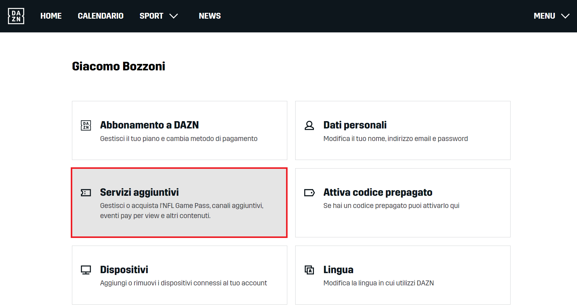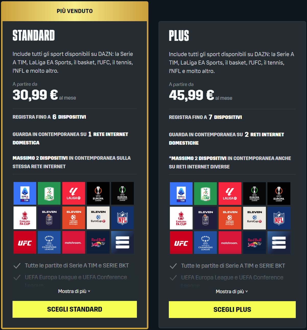 DAZN Plus include gli stessi contenuti del piano Standard ma con la possibilità di guardarli su 2 dispositivi in contemporanea (massimo 7 registrati) anche su reti internet differenti.