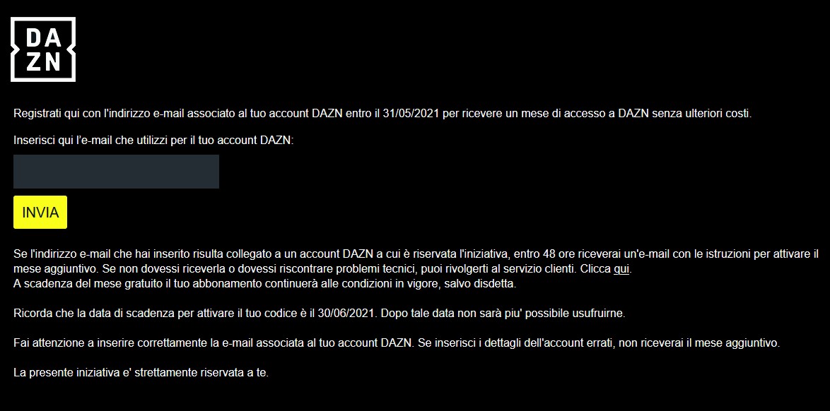 Senza troppo clamore, e comunicandolo solo ai propri abbonati tramite un messaggio e-mail, Dazn ha attivato questa pagina per richiedere un mese aggiuntivo di abbonamento senza ulteriori costi. Dopo aver inserito l’indirizzo collegato al proprio account si riceveranno le istruzioni per ottenere un codice che andrà usato entro il 30 giugno. Per la richiesta c’è invece tempo fino al 31 maggio.