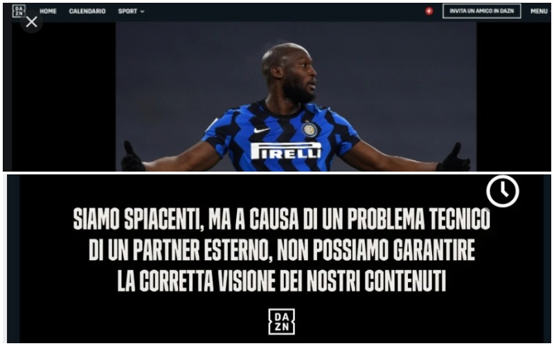 Blackout totale: verificatosi Domenica 11 Aprile che ha oscurato le due partite Inter-Cagliari e Verona-Lazio. A macchia di leopardo in varie parti d’Italia tantissimi abbonati a DAZN non sono riusciti a connettersi sin dall’inizio, ritrovandosi a guardare messaggi di indisponibilità del servizio affiancati da un fermo immagine di Lukaku.