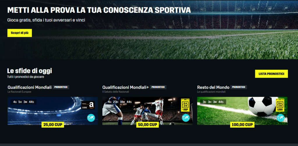 All’interno della piattaforma, sottolinea Dazn, non avviene alcuno scambio di denaro: i giocatori, al momento della registrazione, ricevono fino a 1000 gettoni virtuali (CUP) con cui possono partecipare ai giochi.