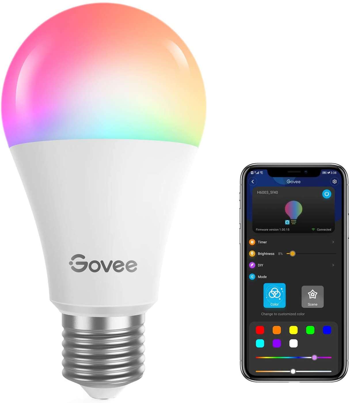 Govee H60033C1IT è una lampadina smart Wi-Fi con doppio chip led bianco (RGBWW) per generare fino a 16 milioni di colori e una forte luce bianca calda (2700K), fredda (6500K) o qualsiasi altra tonalità intermedia.