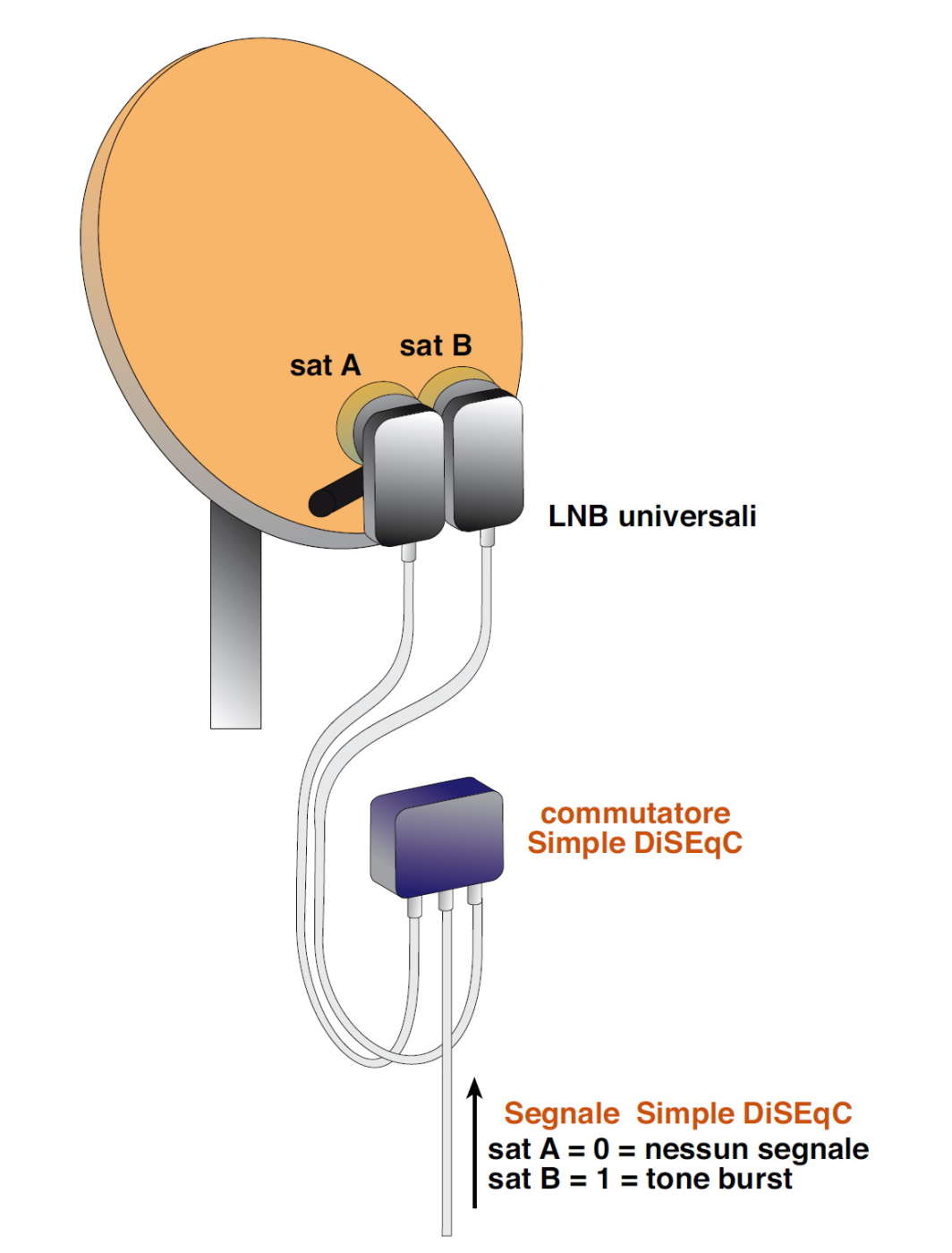 Una parabola Dual Feed con due LNB separati richiede la versione più semplice del protocollo DiSEqC, ovvero la “Simple Tone Burst” (chiamata anche “Simple DiSEqC o Mini DiSEqC) supportata da tutti i decoder e Tv DVB-S/S2.