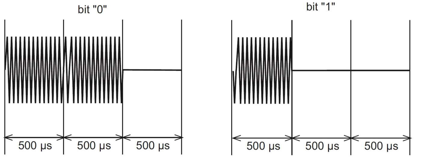 Il messaggio digitale trasmesso dal decoder viene applicato al tono a 22 kHz secondo la logica dei “bit”: un bit ha una durata complessiva di 1,5 millisecondi e assume il valore “zero” se il tono è attivo per 0,5 ms (e inattivo per il resto del tempo, cioè 1 ms) oppure “uno” se dura 1 ms (inattivo per 0,5 ms).