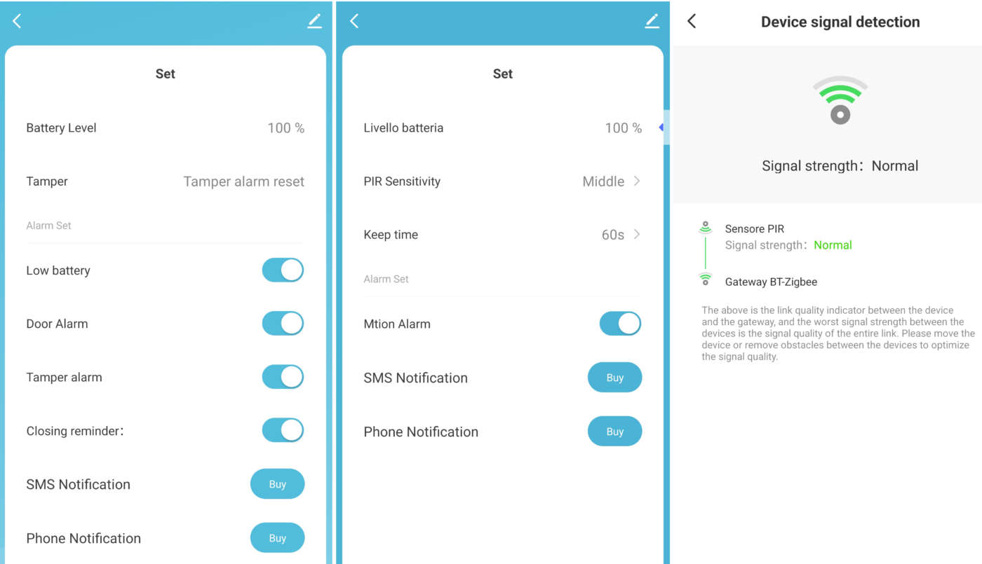 Per configurare i dispositivi basta cliccarli e modificare le impostazioni disponibili (es.: sensibilità rilevamento infrarosso, notifiche varie, ecc.). Nelle stesse schermate si trovano anche l’indicatore di carica della batteria, le informazioni del dispositivo (es.: ID virtuale, Mac, versione fw, ecc.) e il test del segnale Zigbee.