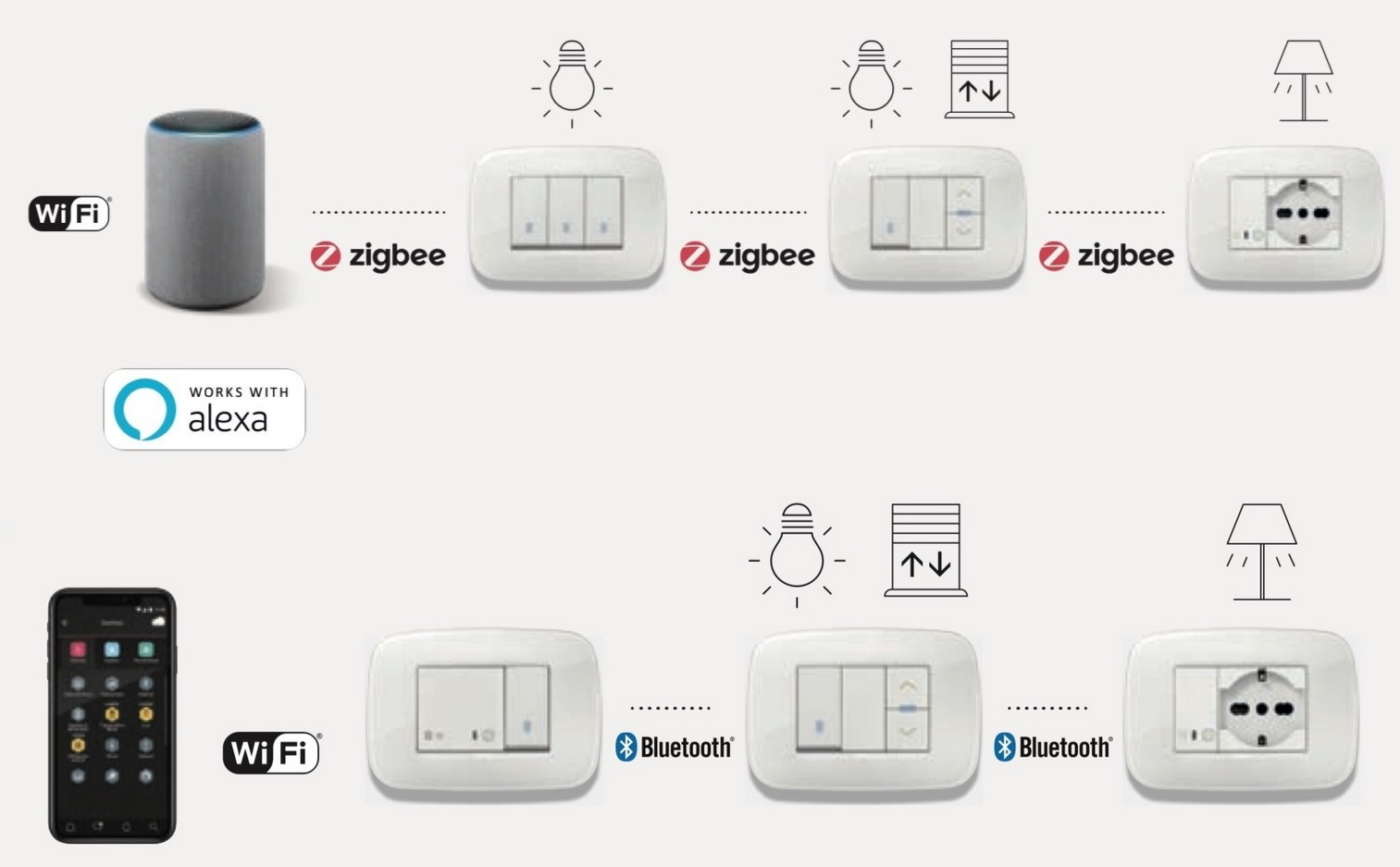 Esistono varie alternative al Wi-Fi per connettere i dispositivi domotici al modem/router e consentirne il controllo da locale e remoto. Tutti i moduli smart retrofit di BTicino, Vimar e Gewiss utilizzano tecnologie più affidabili come i collegamenti radio proprietari, il Bluetooth e lo Zigbee.