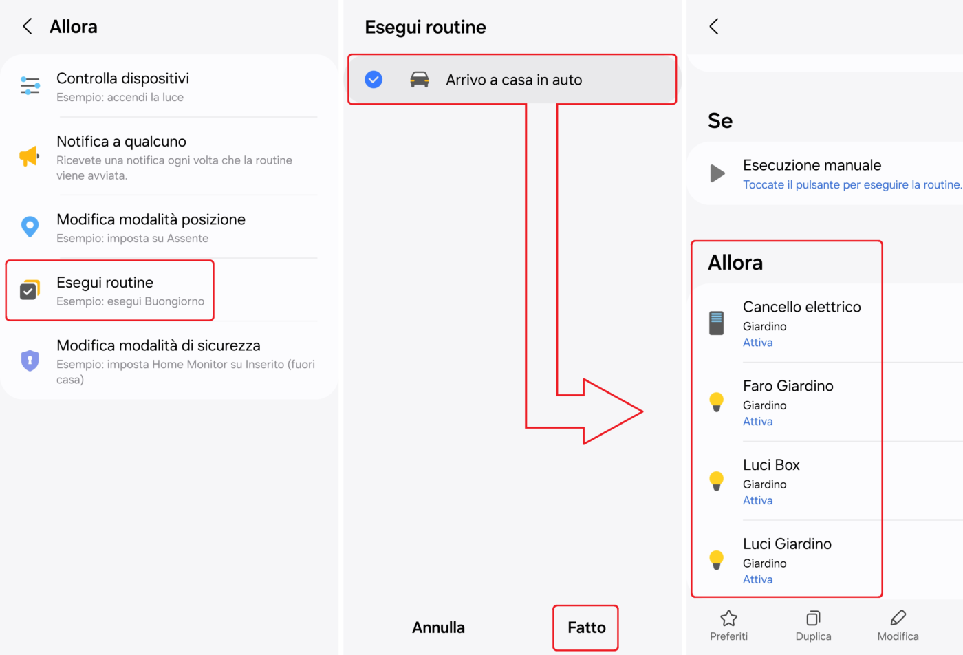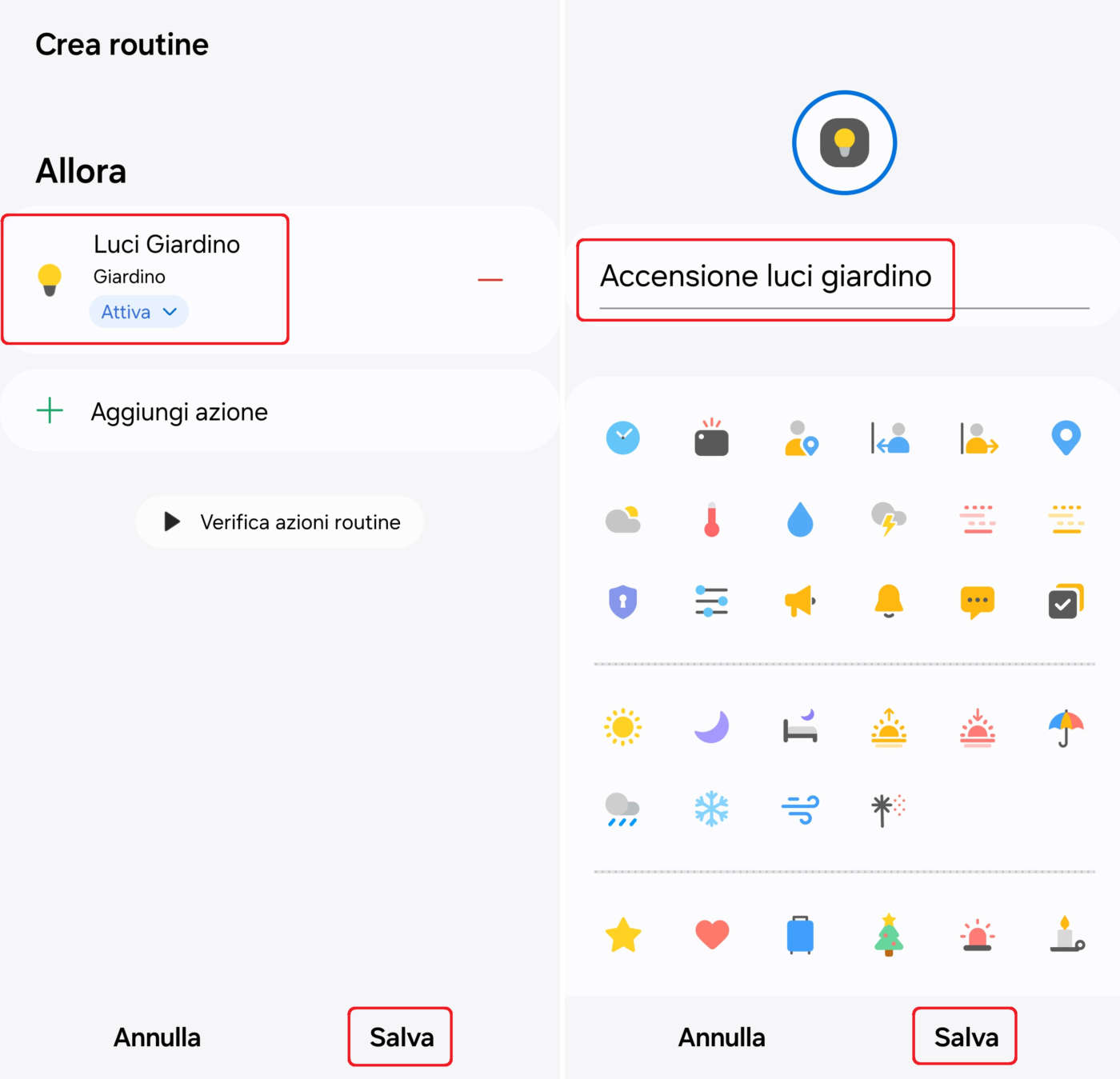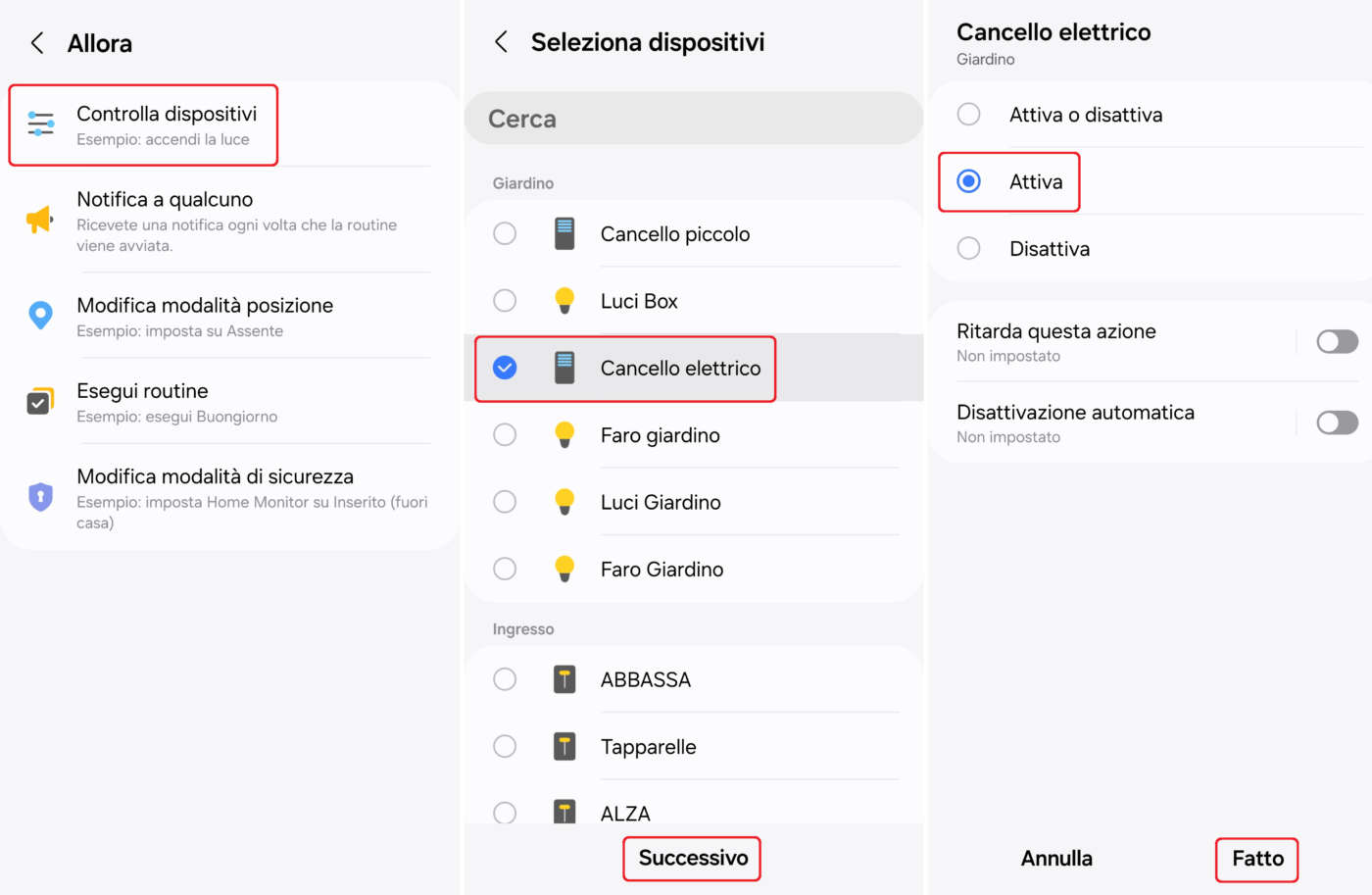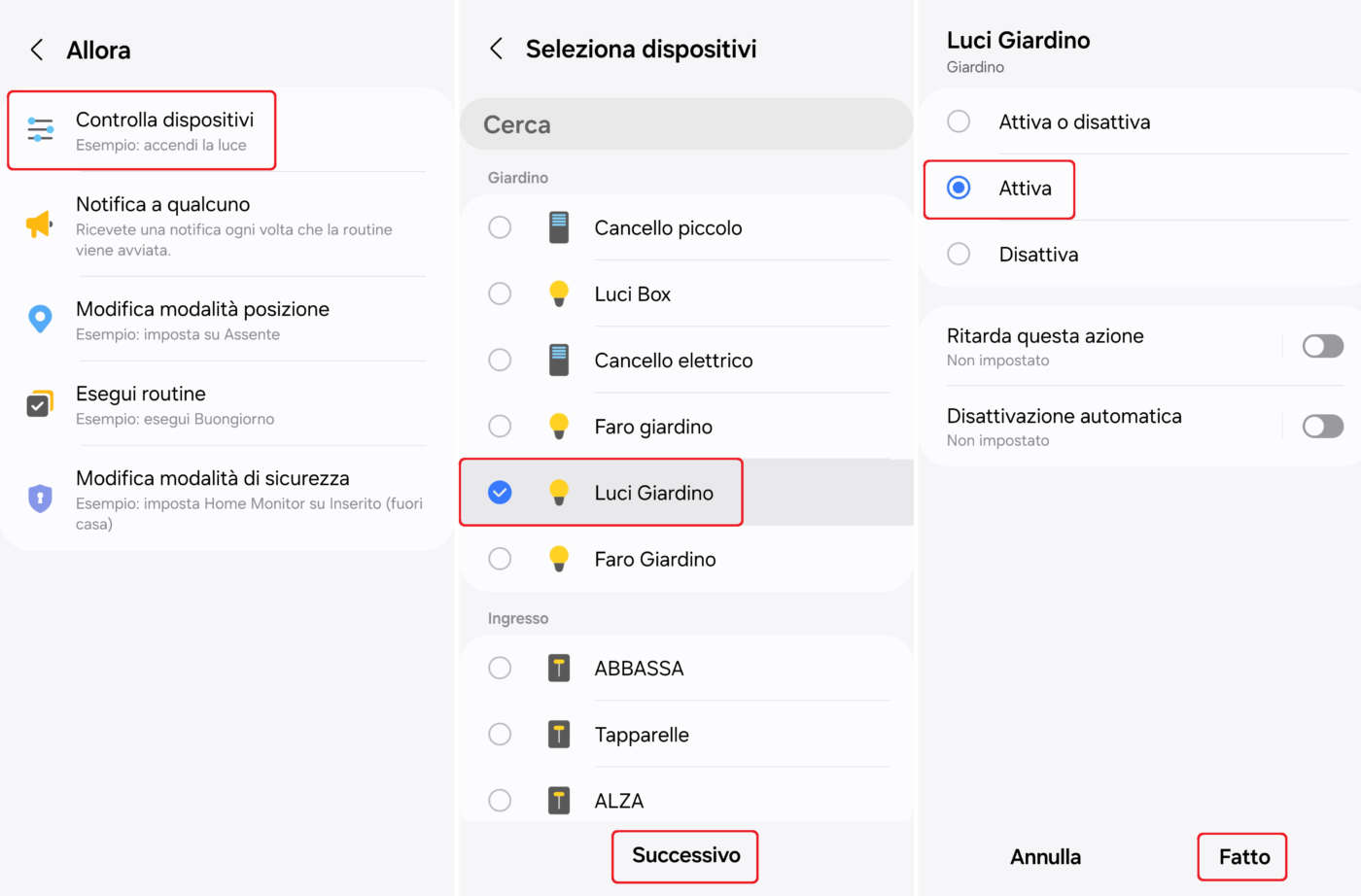 - Cliccate su Controlla dispositivi, selezionate le luci da comandare (es.: luci giardino), cliccate su Successivo e poi su Attiva;
