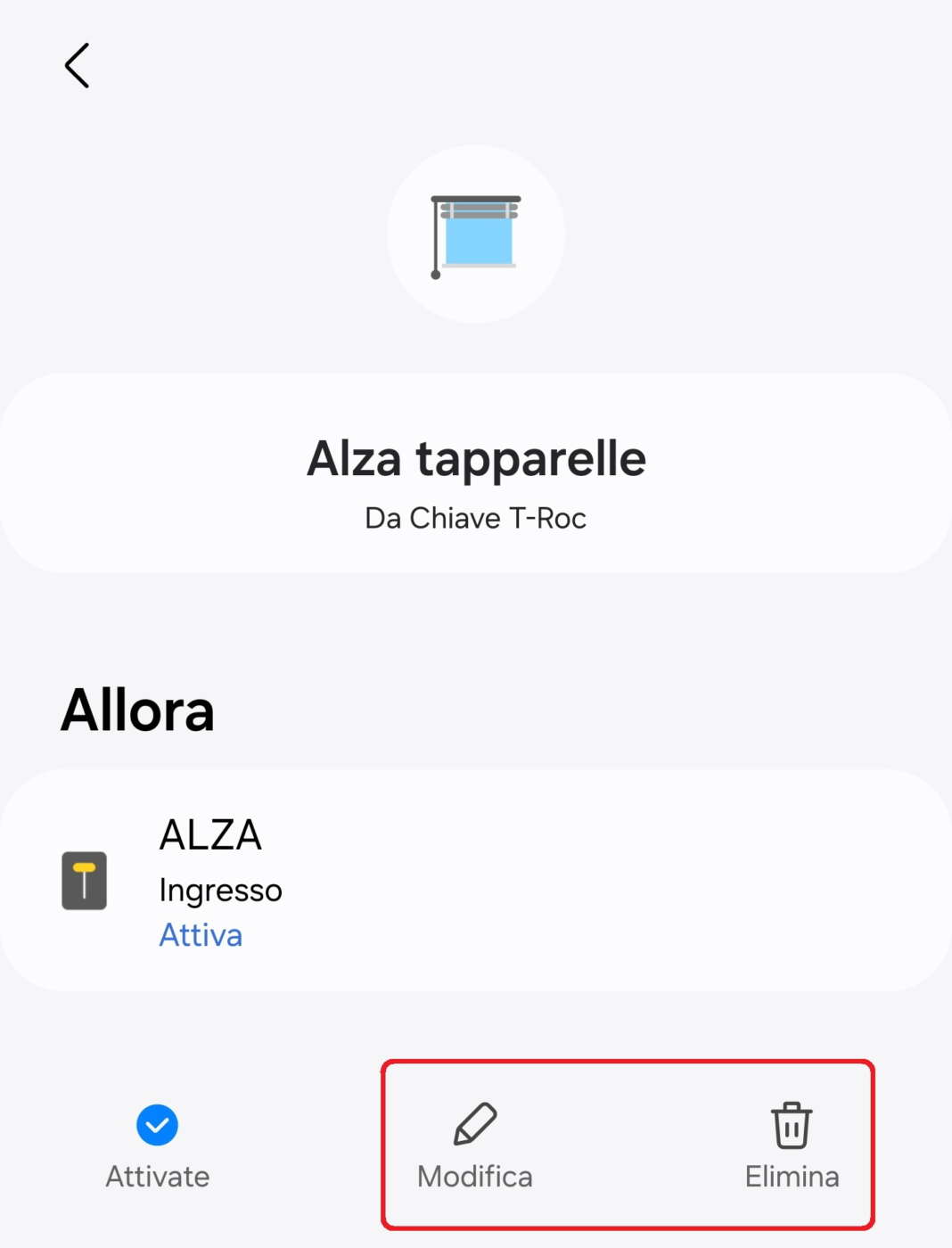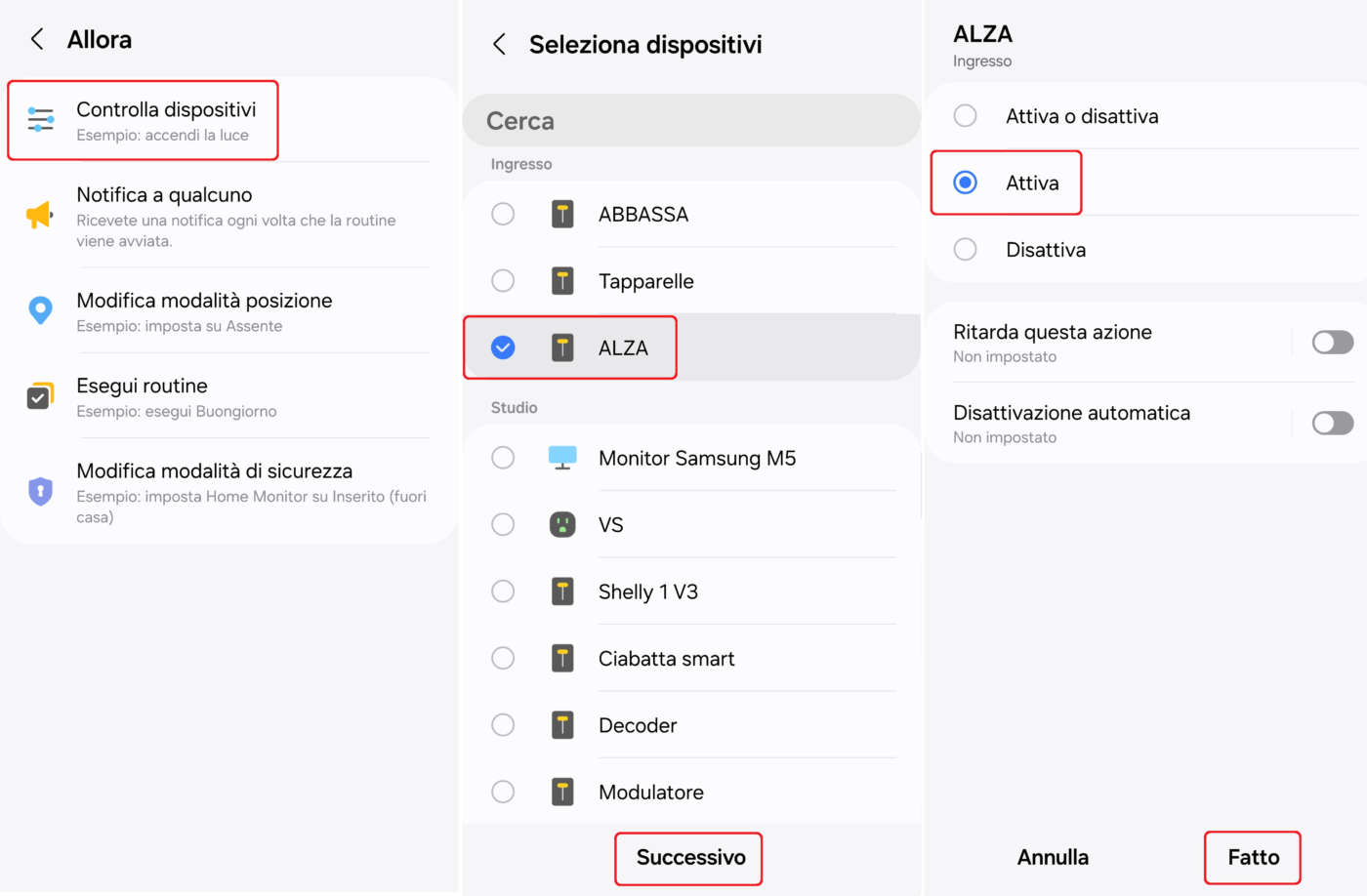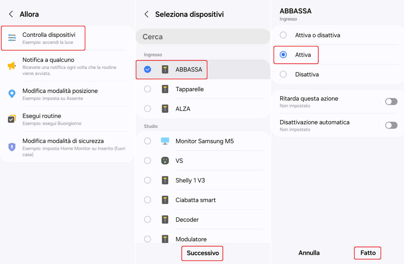 - Cliccate su Controlla dispositivi, selezionate il dispositivo da utilizzare (es.: smart switch che gestisce la salita e la discesa delle tapparelle) o il comando (salita), cliccate su Successivo, poi su Attiva;