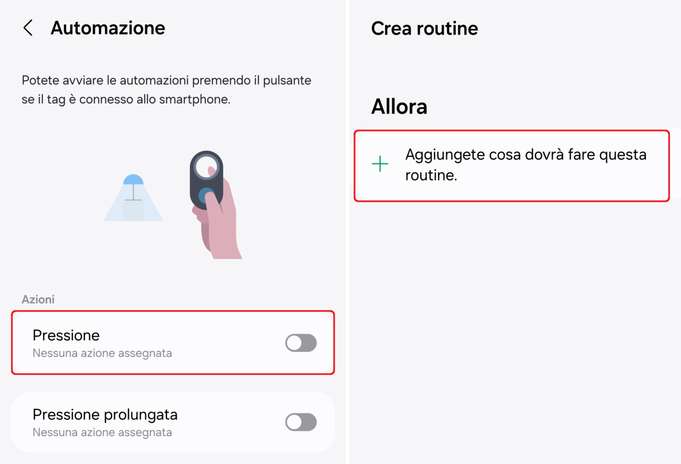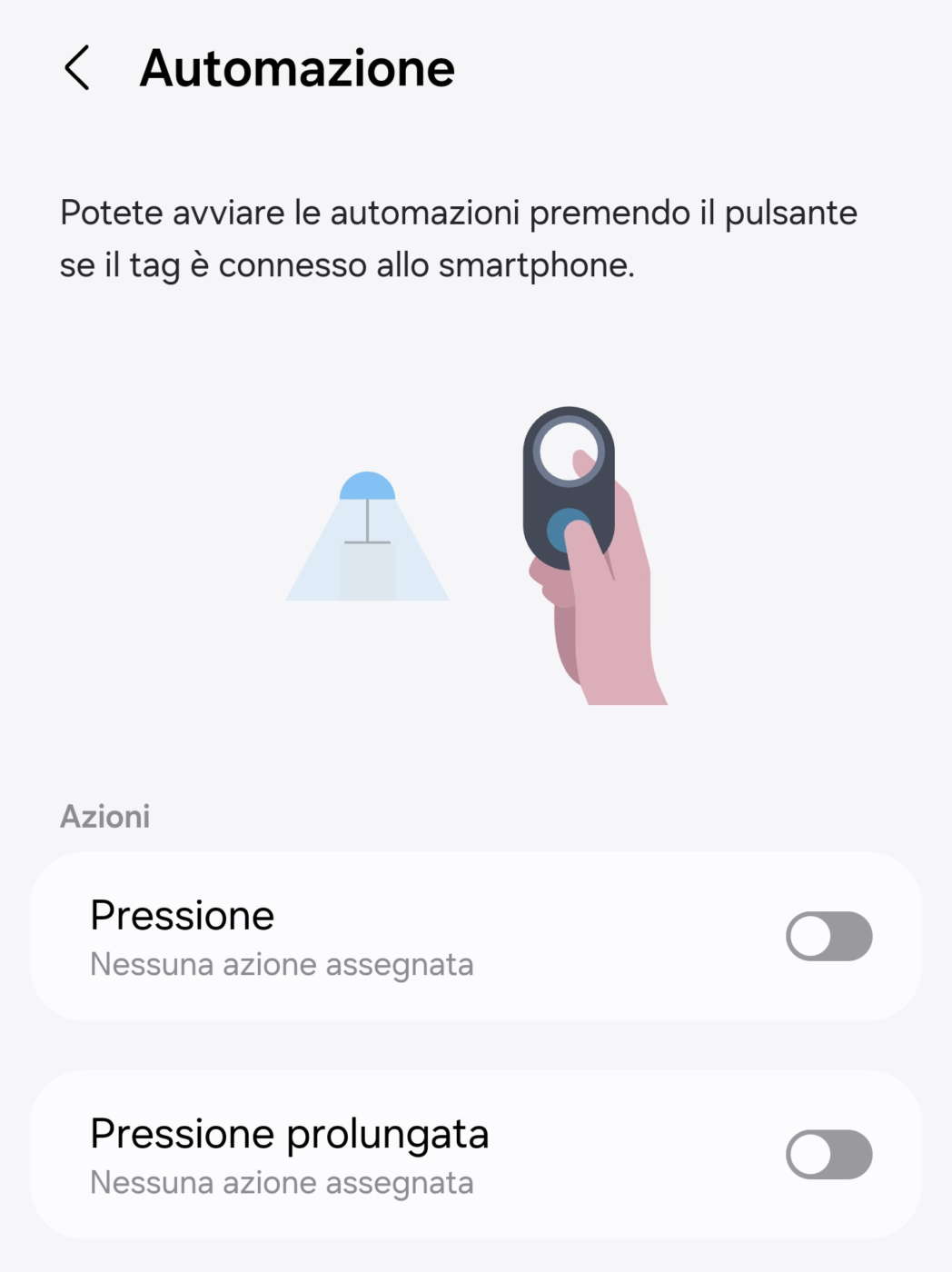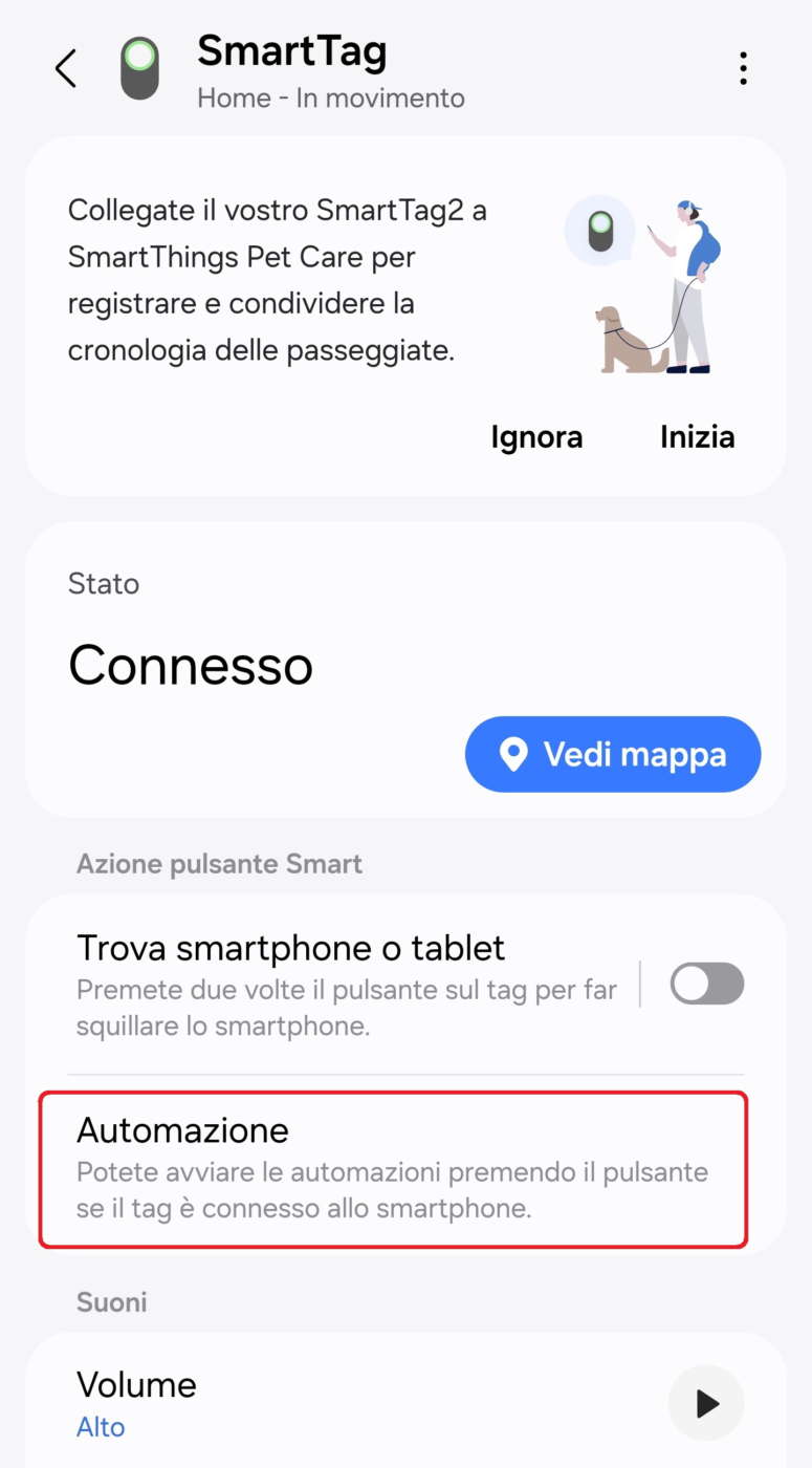 Per programmare il tracker ed utilizzarlo come smart button dovete sempre selezionarlo dalla scheda Dispositivi, scorrere in basso fino ad Automazione e impostare le azioni associate ai due comandi supportati dal pulsante dello SmartTag 2, ovvero la pressione breve e prolungata.