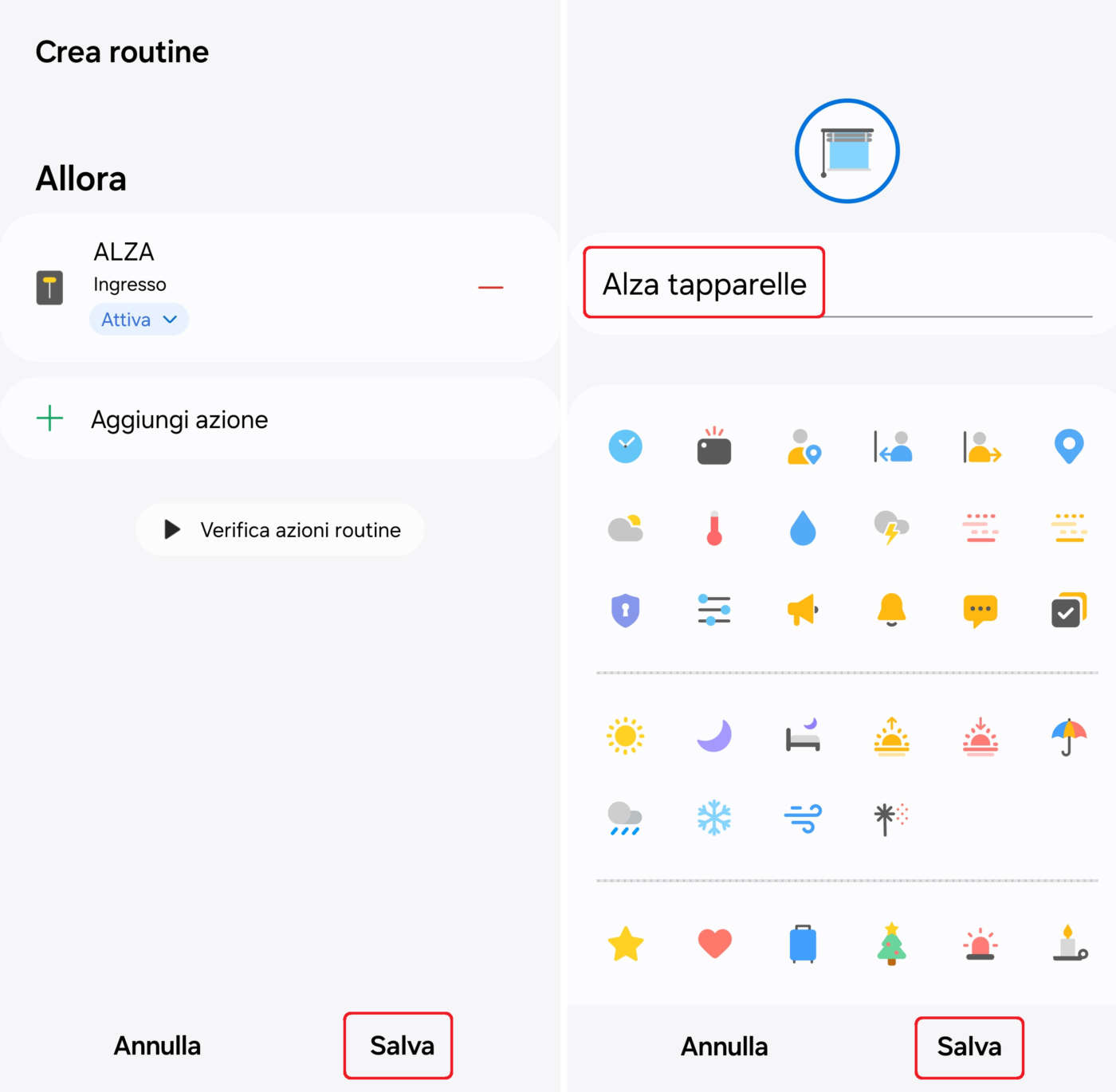- Cliccate su Fatto, controllate che l’azione appena registrata compaia nella scheda Automazioni, cliccate su Salva, date un nome all’azione (es.: alza tapparelle) e cliccate ancora su Salva per terminare. Dopo qualche secondo lo SmartTag 2 emetterà un bip di conferma;
